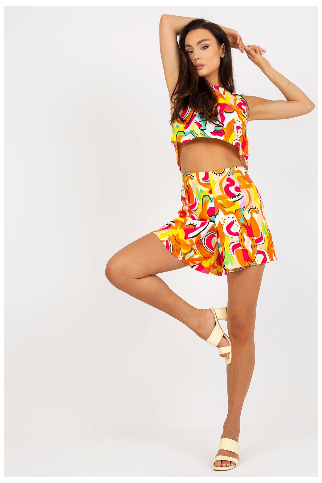 Letní souprava sestávající z topu a šortek. Krátký top volného střihu s ozdobným zavazováním na zádech. Šortky se širokými nohavicemi, krytý zip, elastický pas. Sada je ideální pro mnoho příležitostí.