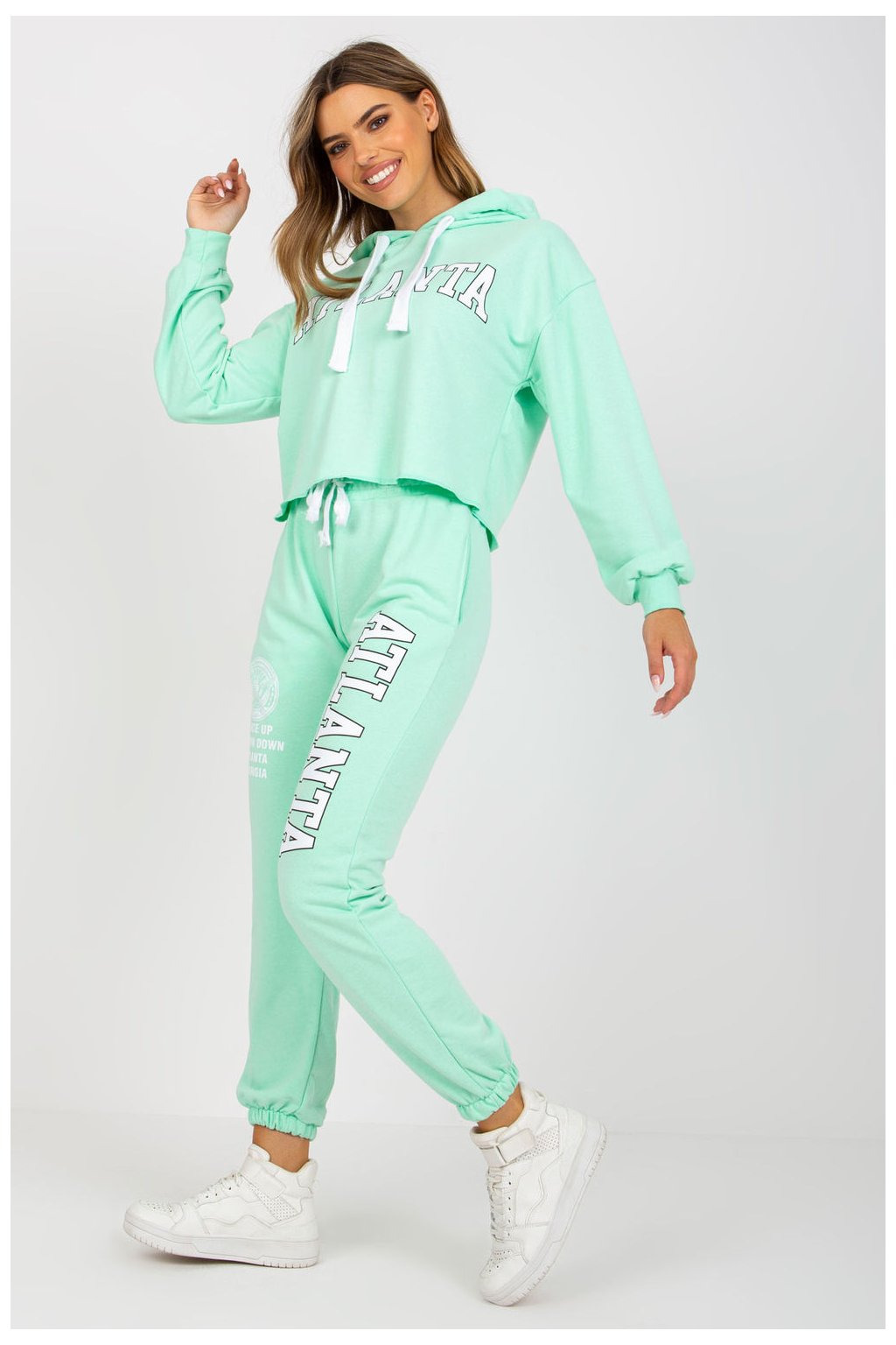Tepláková souprava sestávající z mikiny a kalhot. Mikina s dlouhými rukávy a kapucí. Dlouhé kalhoty s vysokým pasem, elastickým pasem a vázáním, s kapsami na bocích.