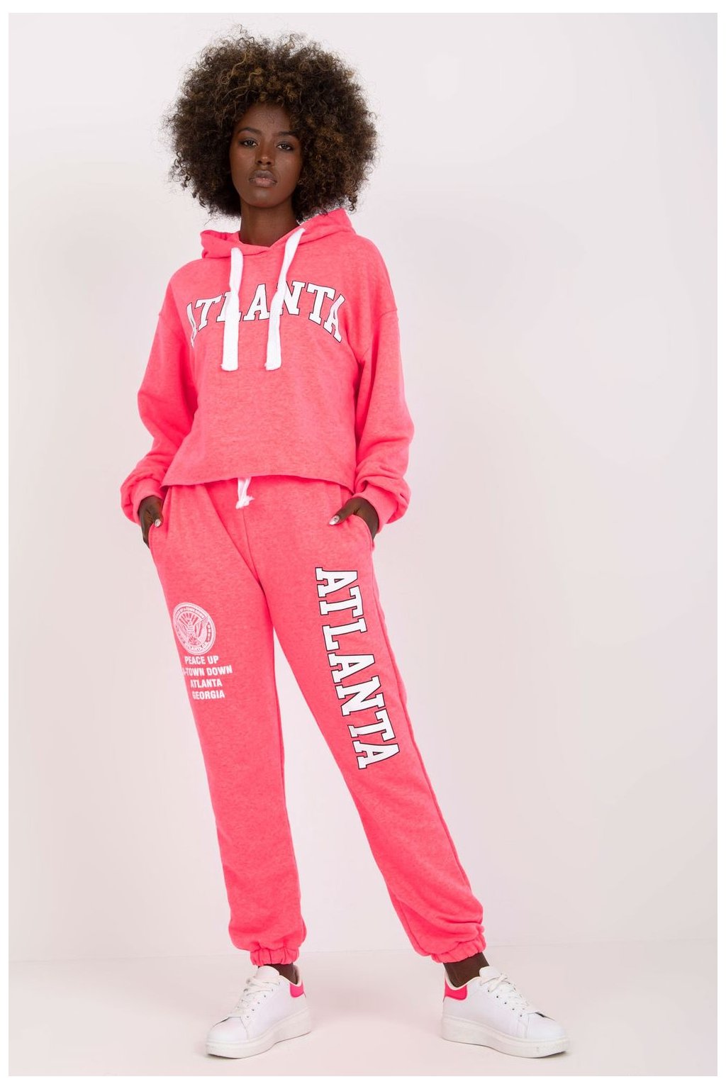 Tepláková souprava sestávající z mikiny a kalhot. Mikina s dlouhými rukávy a kapucí. Dlouhé kalhoty s vysokým pasem, elastickým pasem a vázáním, s kapsami na bocích.