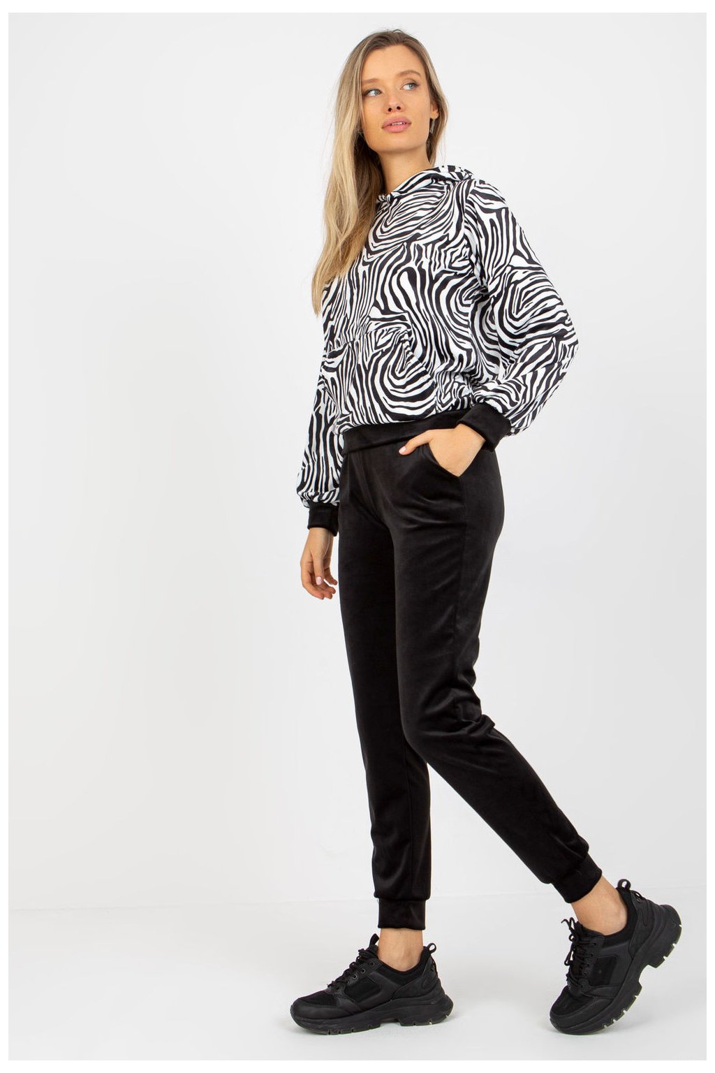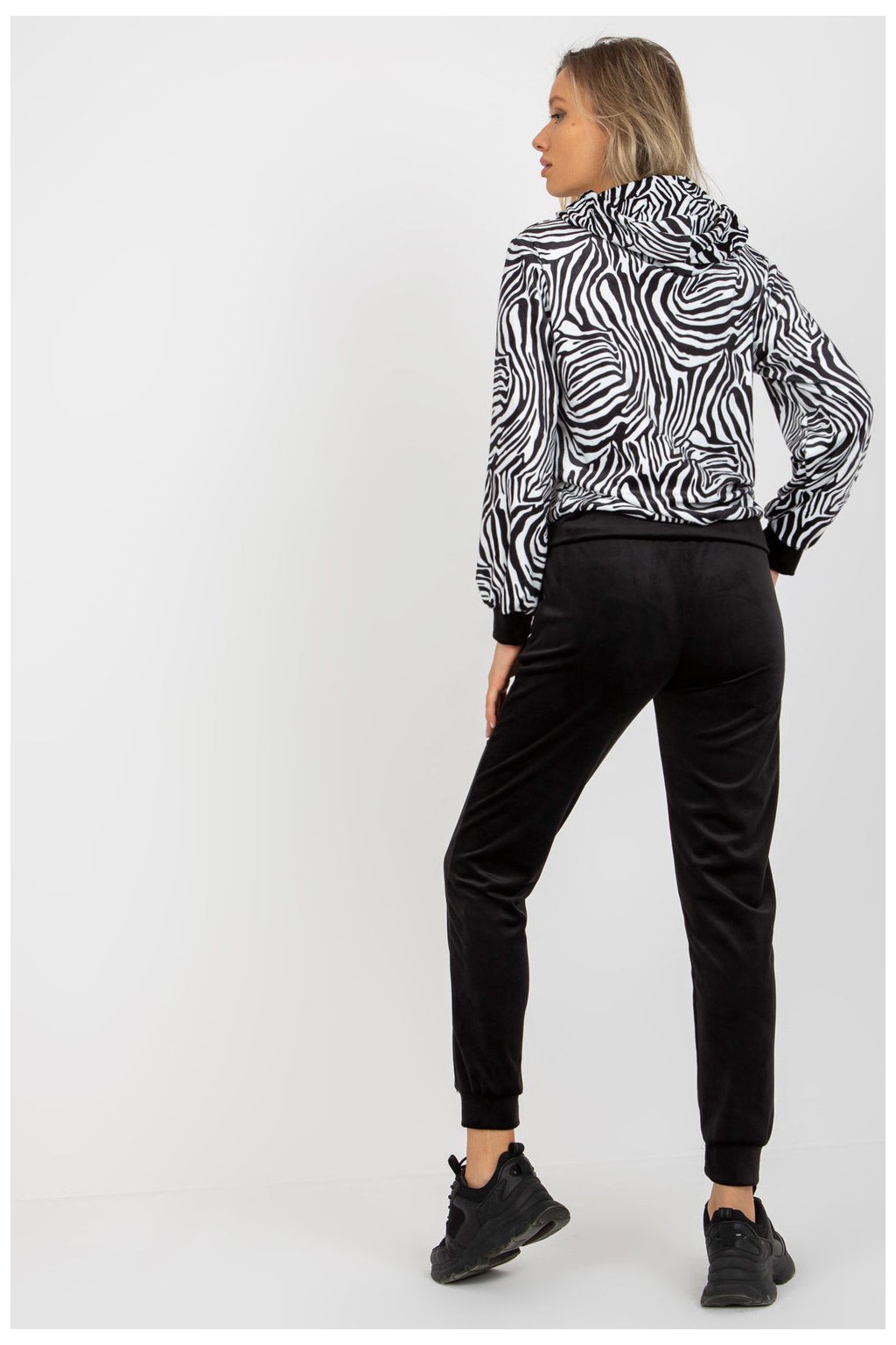 Velurová souprava sestávající z mikiny a kalhot. Halenka se zvířecím potiskem, dlouhými rukávy a kapucí. Klokaní kapsa na přední straně. Dlouhé kalhoty s nakládanými kapsami.