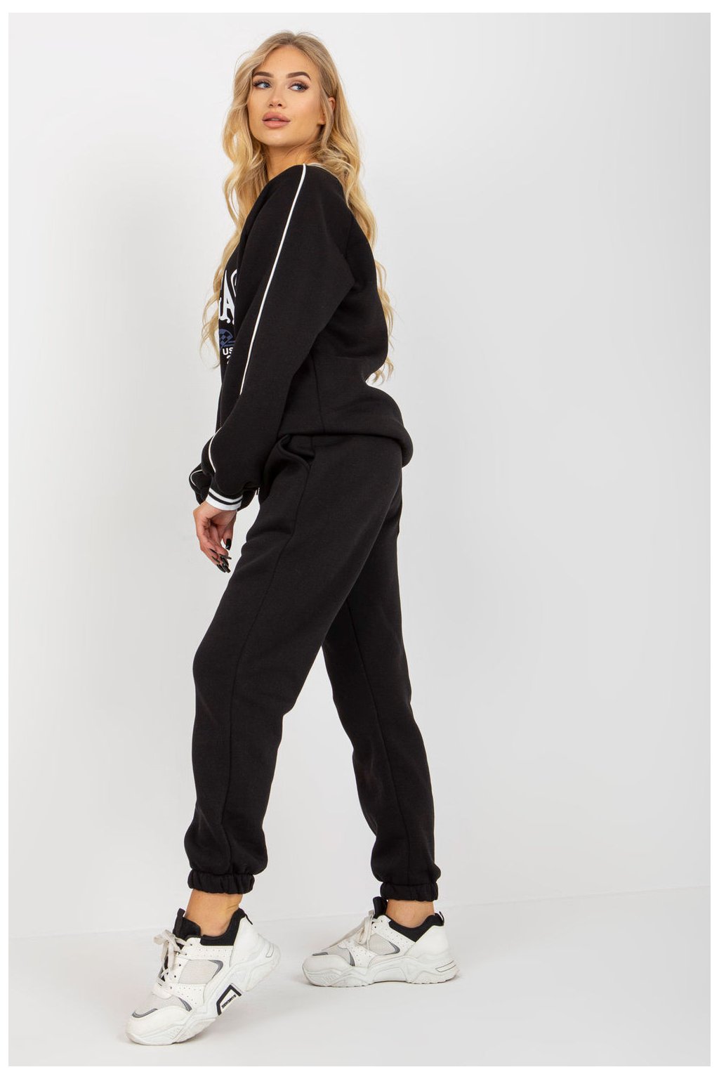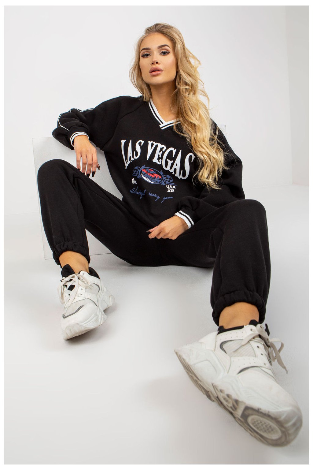 Tepláková souprava sestávající z mikiny a kalhot. Halenka s dlouhými rukávy a výstřihem do V. Dlouhé kalhoty se zavazováním v pase a nakládanými kapsami.