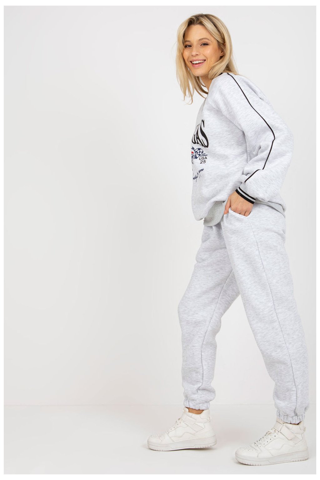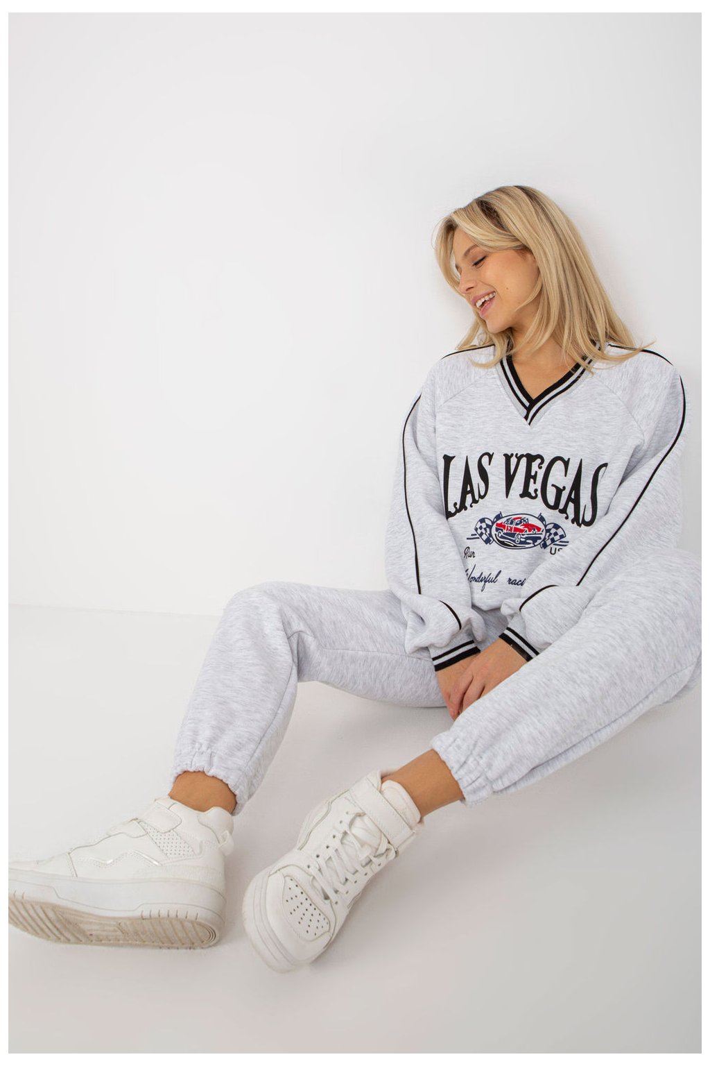 Tepláková souprava sestávající z mikiny a kalhot. Halenka s dlouhými rukávy a výstřihem do V. Dlouhé kalhoty se zavazováním v pase a nakládanými kapsami.