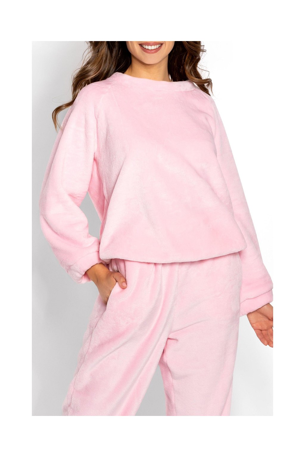 Pohodlné teplé dámské teplákové šaty nadměrné velikosti. Je vyrobena z vysoce kvalitního, na dotek měkkého velurového mikrofleecového úpletu. Halenka s dlouhými manžetovými rukávy. Lemovaný výstřih. Včetně dlouhých kalhot. Skryté kapsy na bocích. Nohy s lemem v tunelu.