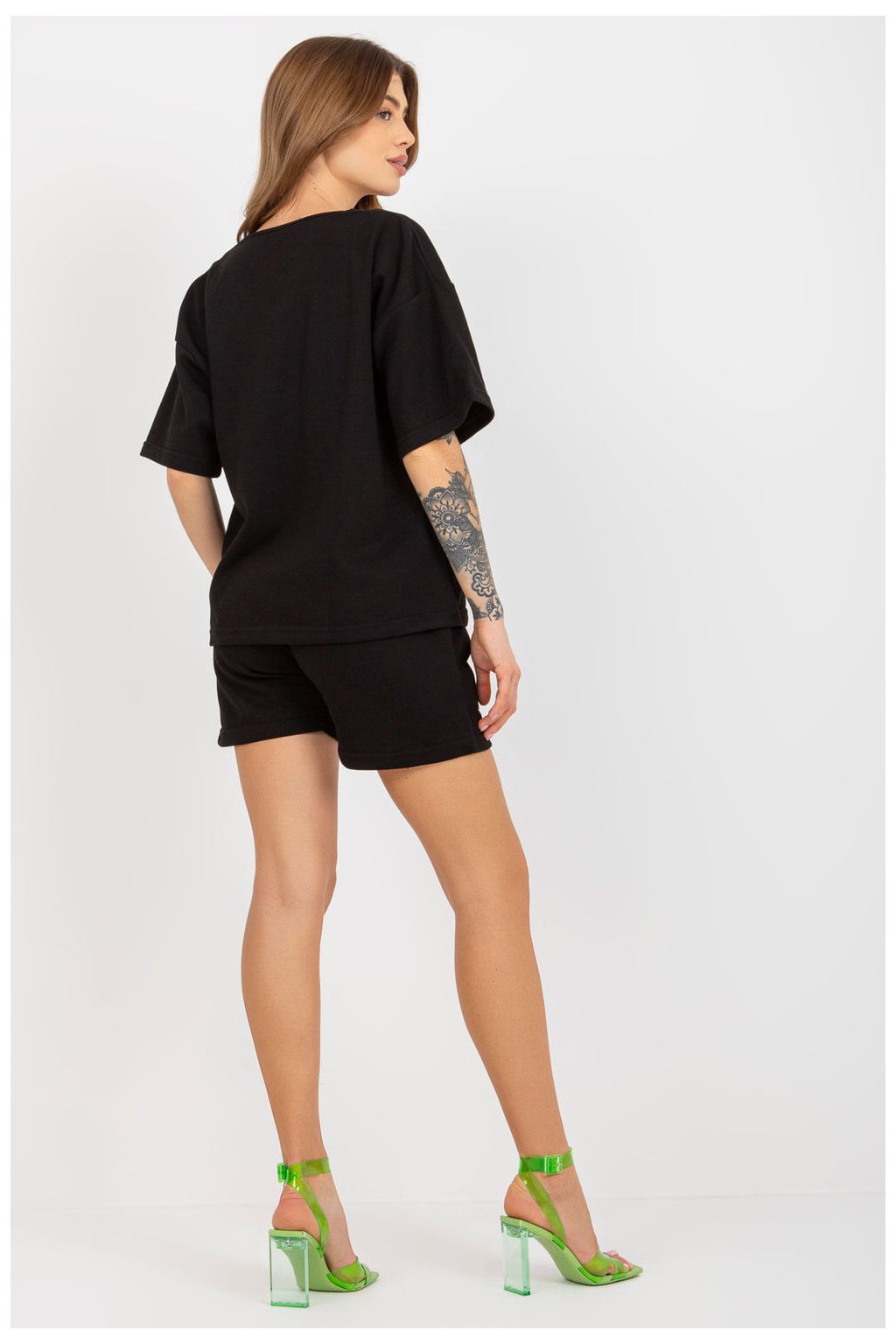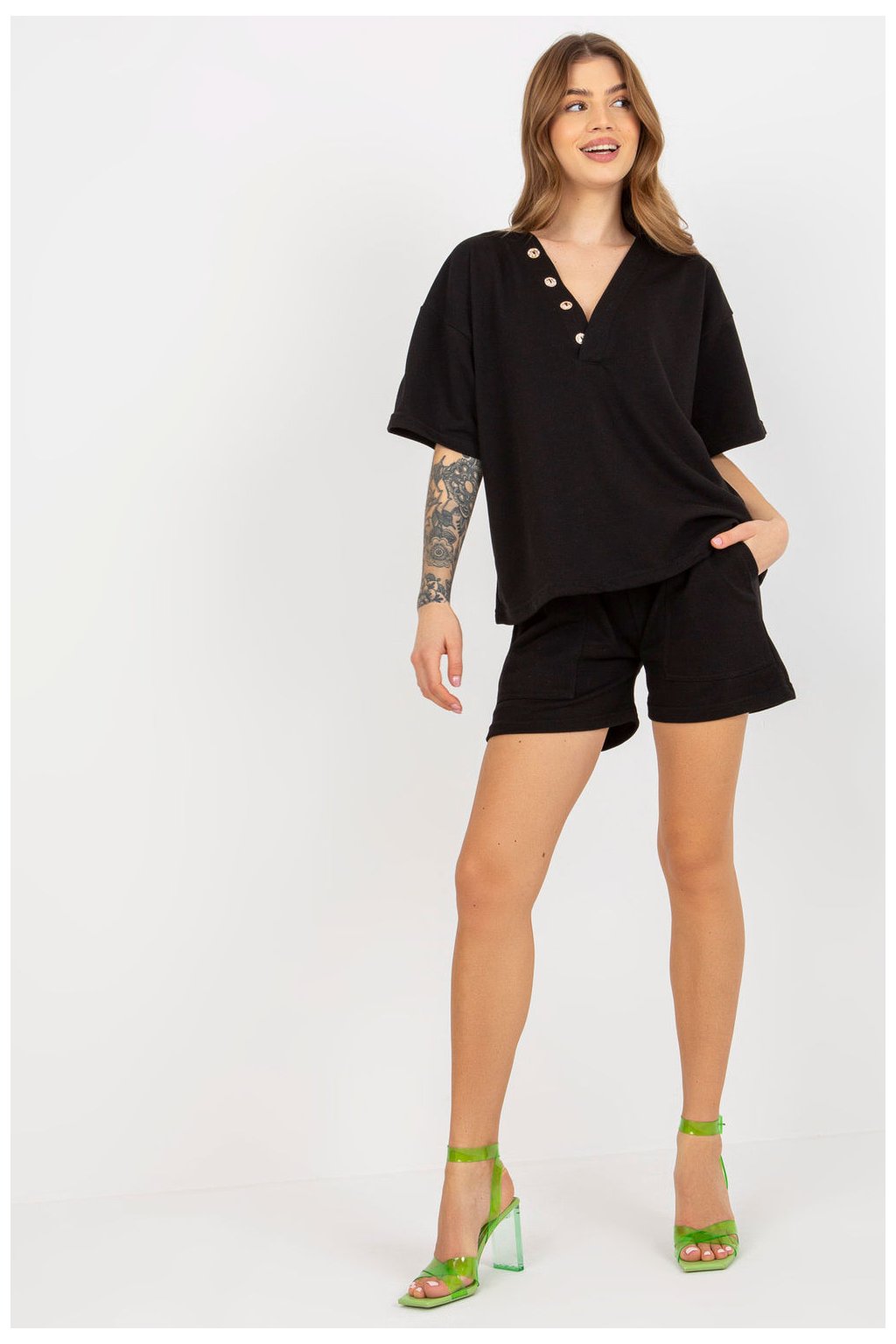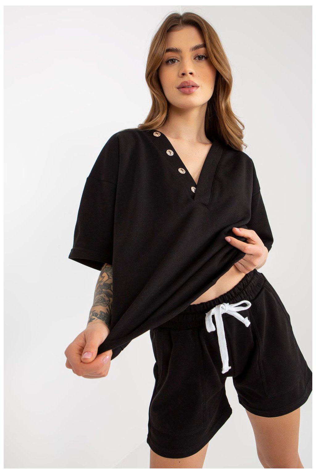 Tepláková souprava sestávající z halenky a šortek. Halenka s krátkými rukávy a výstřihem do V. Šortky se zavazováním v pase a kapsami.