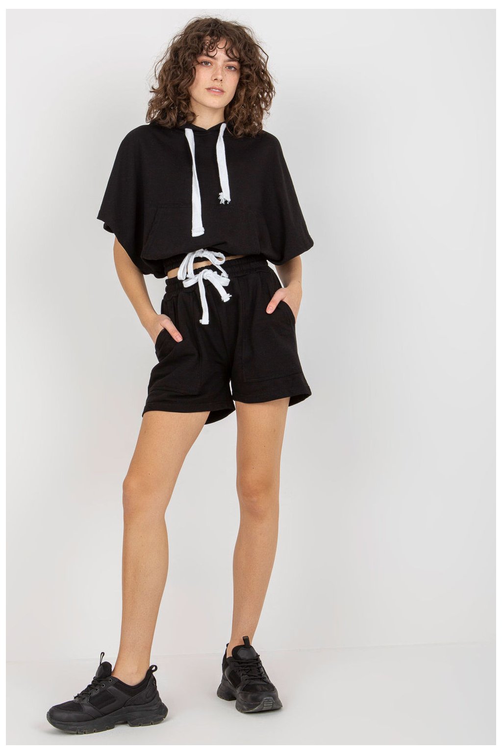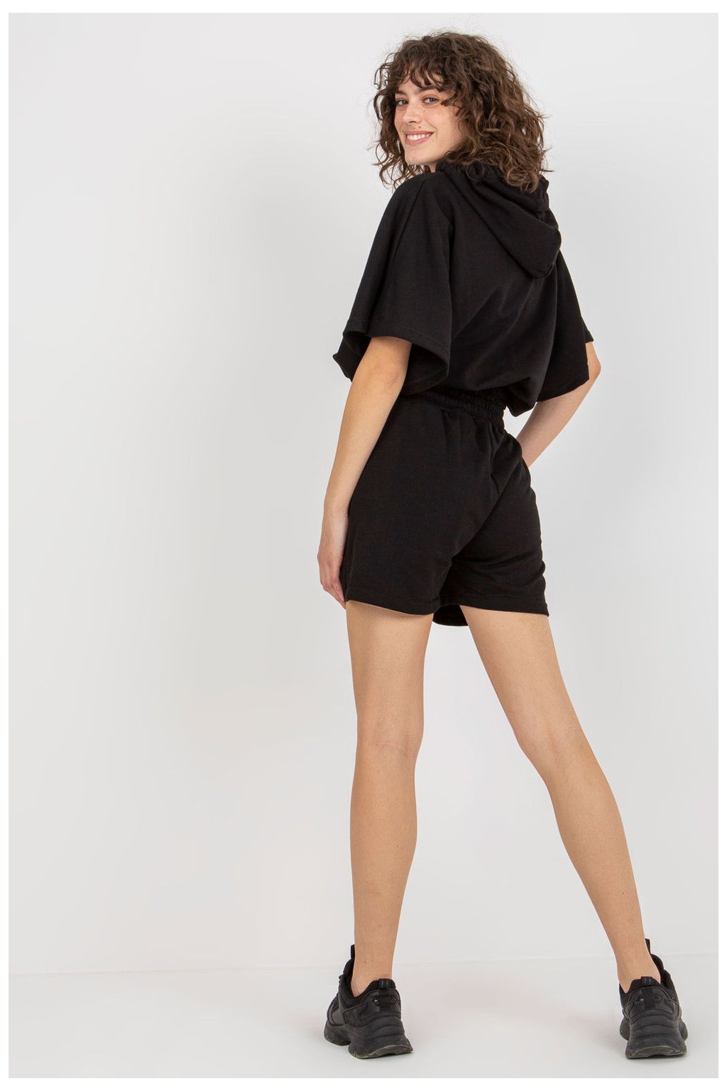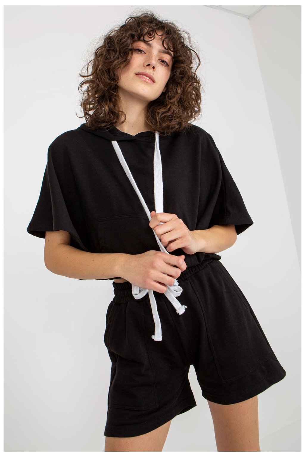 Tepláková souprava sestávající z halenky a šortek. Blůza s krátkými širokými rukávy, kapucí a klokaní kapsou. Šortky se zavazováním v pase a kapsami.