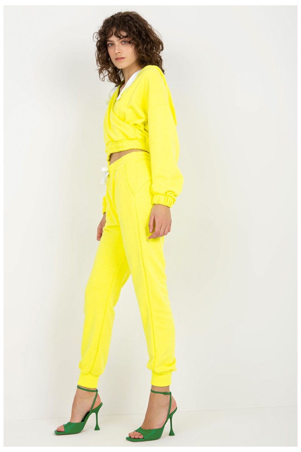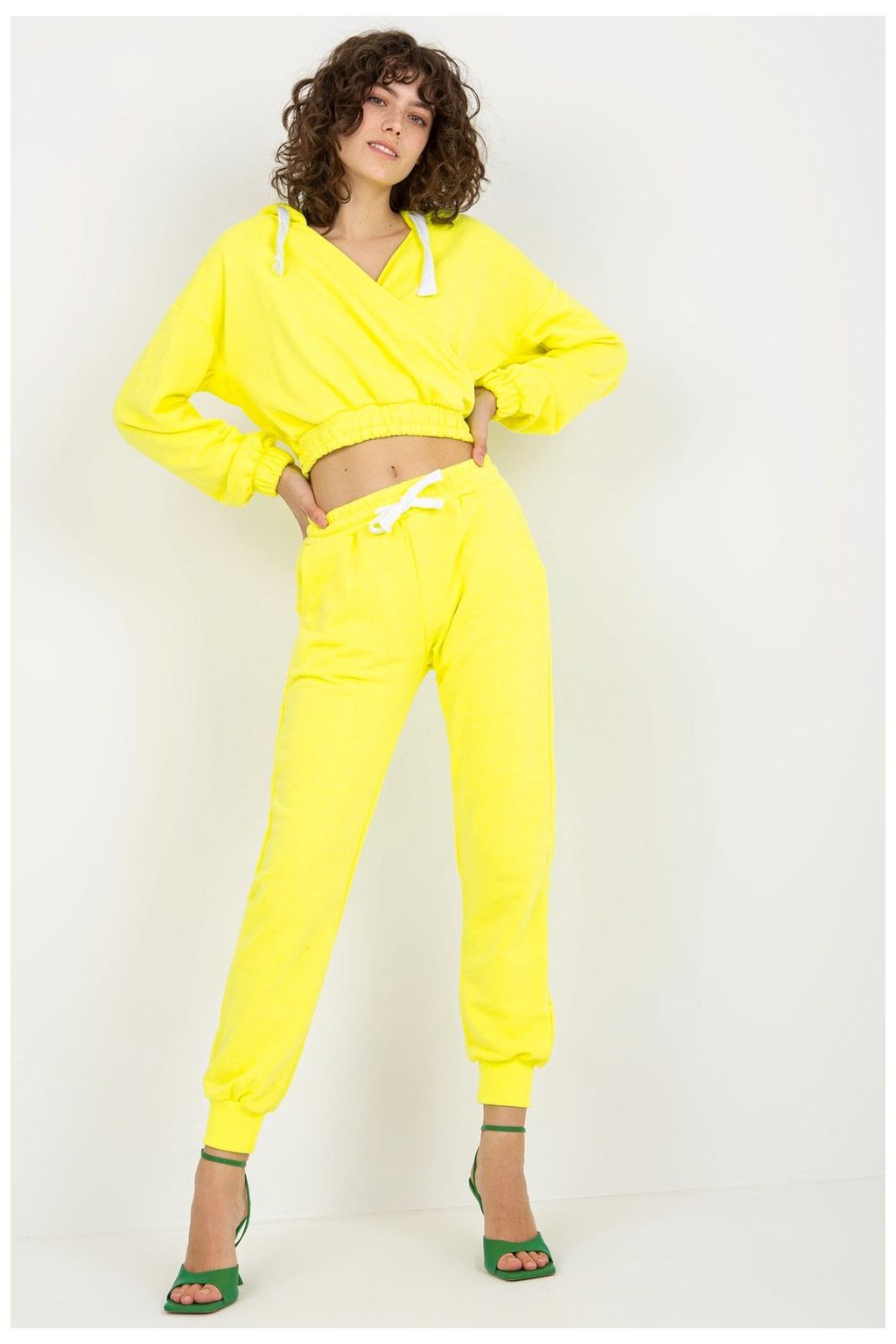 Tepláková souprava sestávající z mikiny a kalhot. Krátká mikina s dlouhými rukávy, kapucí a obálkovým výstřihem. Dlouhé kalhoty se zavazováním v pase a nakládanými kapsami.