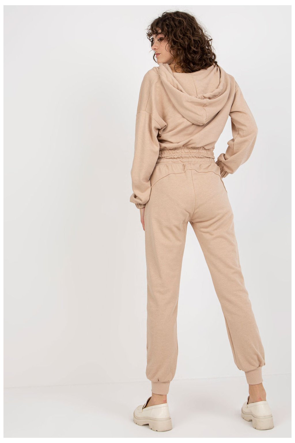 Tepláková souprava sestávající z mikiny a kalhot. Krátká mikina s dlouhými rukávy, kapucí a obálkovým výstřihem. Dlouhé kalhoty se zavazováním v pase a nakládanými kapsami.