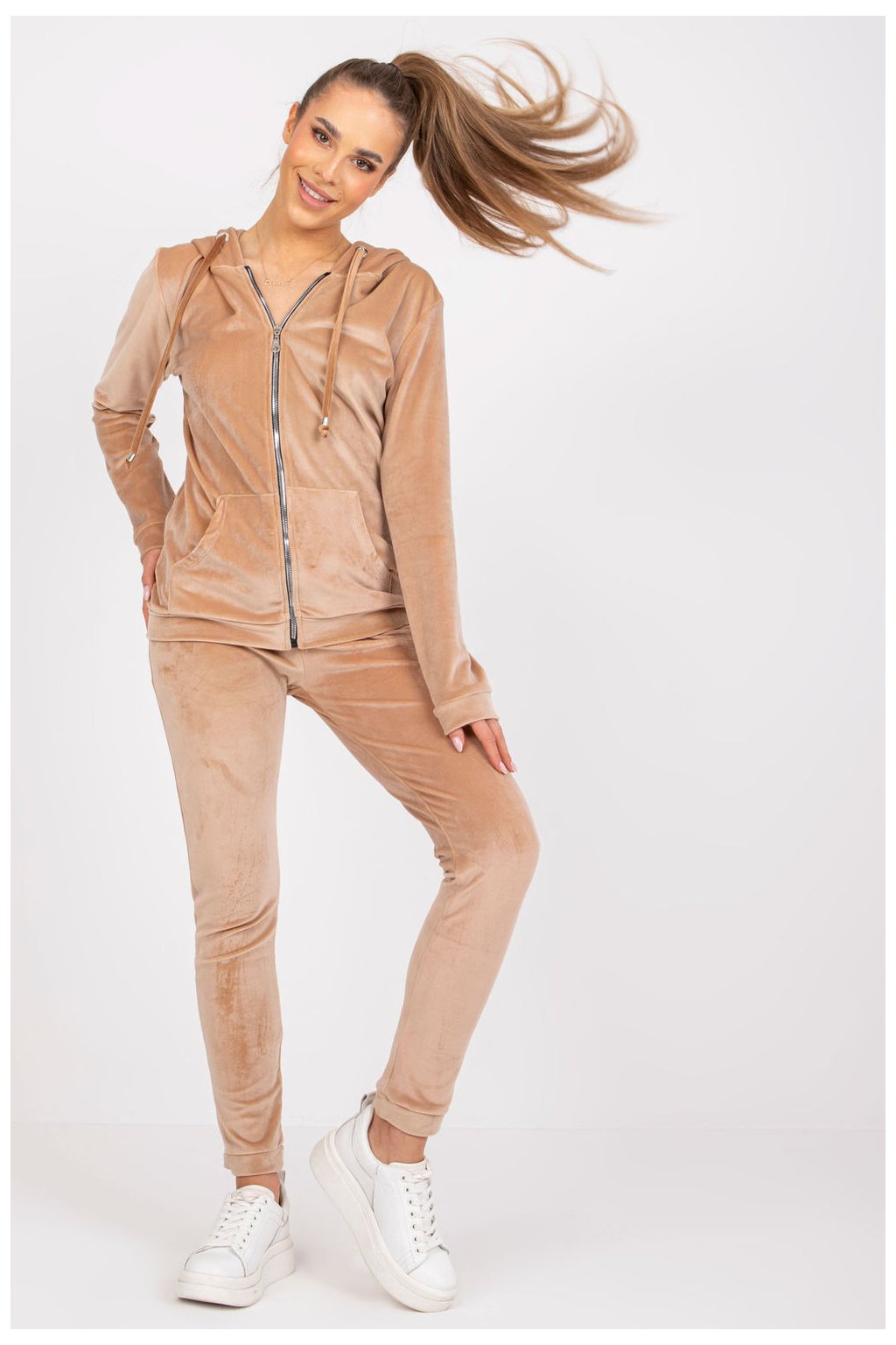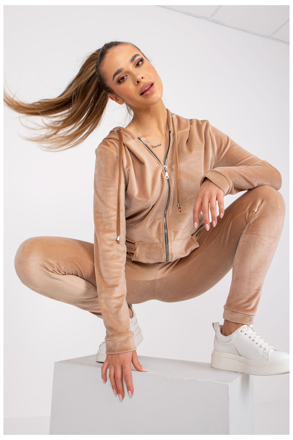 Velurová souprava sestávající z mikiny a dlouhých kalhot. Mikina s dlouhými rukávy a kapucí, zapínání na zip. Na přední straně jsou kapsy na druky. Dlouhé kalhoty se stahovací šňůrkou v pase a nakládanými kapsami na bocích.