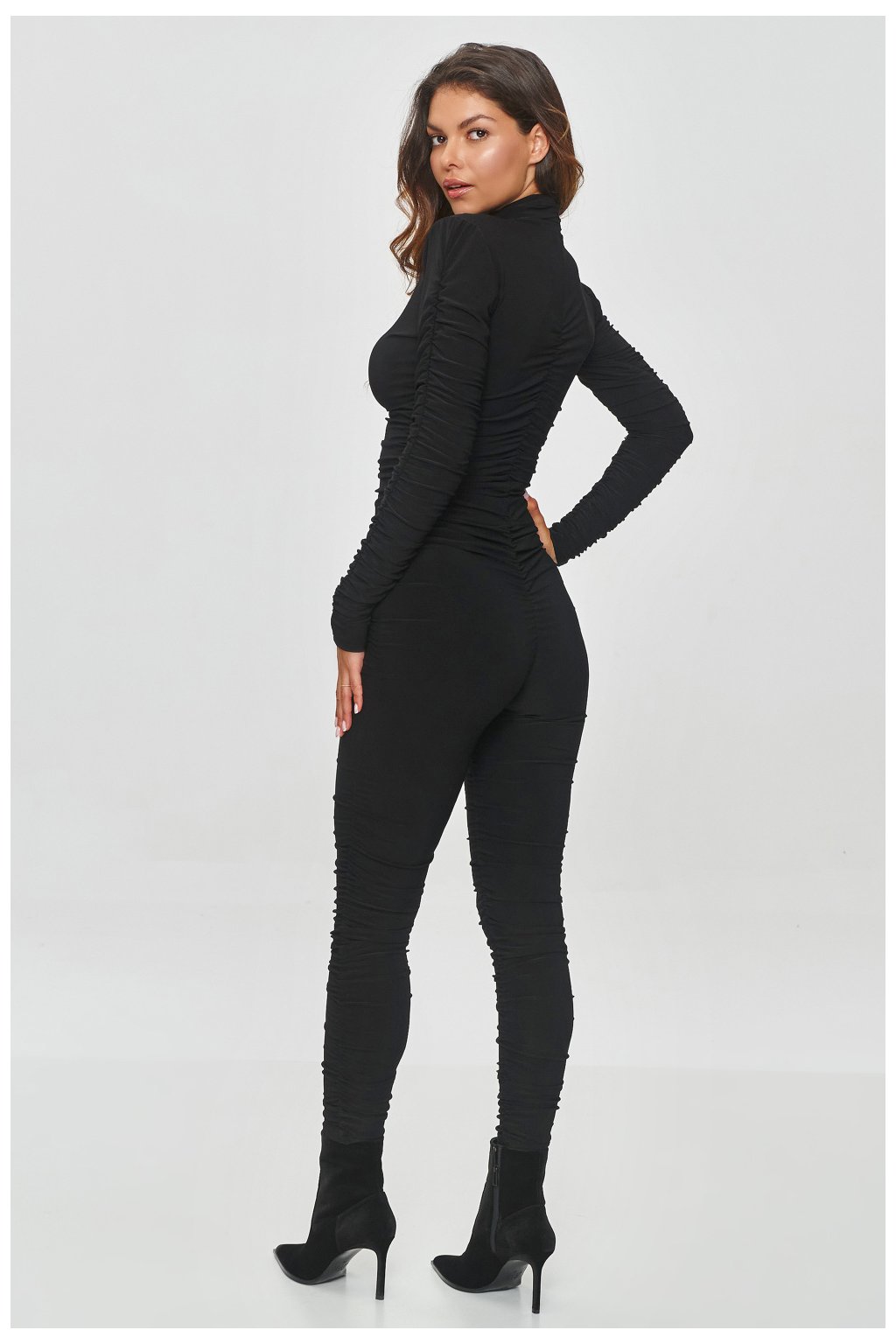 Elegantní černý komplet s elegantním, přiléhavým střihem. Blůza má dlouhé rukávy a vysoký výstřih, co dodává celku sofistikovaný a bohatý vzhled. Přechodný šev vpředu a vzadu vytváří záhyby, co přidává texturu a efektně modeluje postavu. Nohavice jsou zúžené, zdůrazňující přiléhavý vzhled a moderní styl. Hladký materiál s lehkým leskem dodává záři a hodí se vždy a všude. Střih tohoto modelu zdůrazňuje pas a přidává smyslnost celému outfitu. Dámský komplet přizpůsobený tvaru postavy vyvolá ty nejskrytější zásoby sexepilu a sebejistoty. Skvělý pro odvážné ženy a pravé fashionistky.