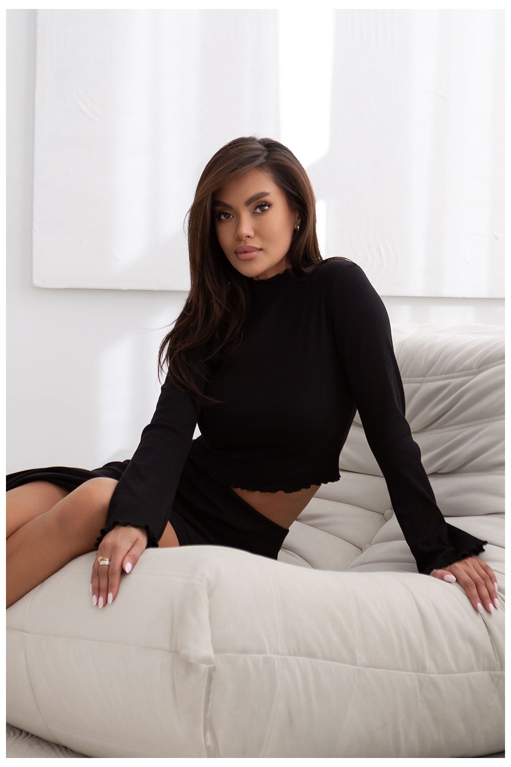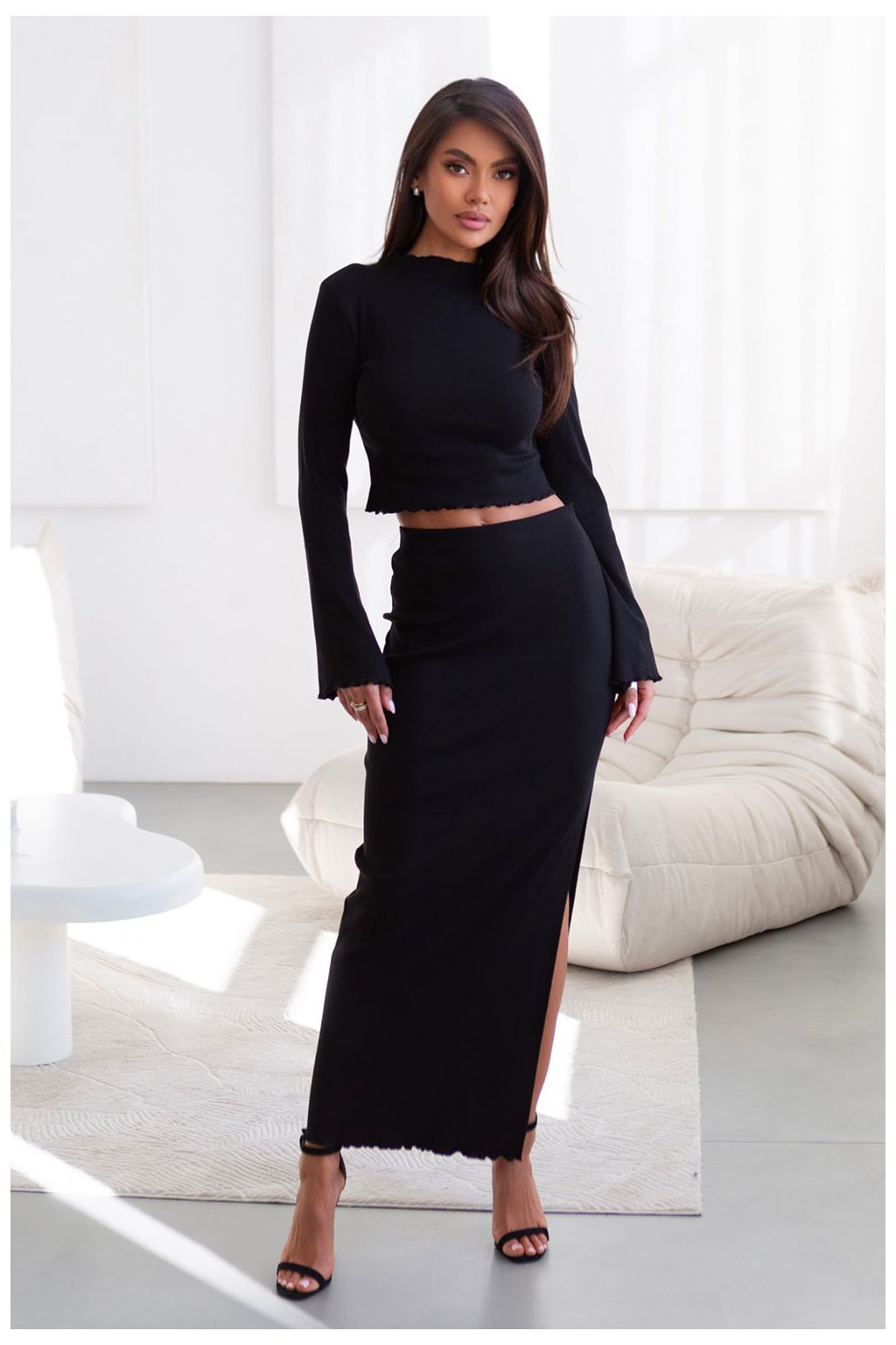Minimalistický a nadčasový celkový vzhled od IVON, tedy sada: blůza s dlouhým rukávem a sukne s rozparkem je jednoznačně must have ve vaší skříni. Sukně v pase má vsazenou gumu. Blůza s dlouhým rozkročeným rukávem a stojáčkem. Sada bez podšívky, ale materiál nesvítí. Jedná se o mimořádně elegantní, ale i multifunkční set, který můžete nosit doslova všude: buď samostatně nebo v kombinaci s jinými kousky oblečení. Módní TIP: můžete dosáhnout efektu odkrytého břicha nebo ne stačí libovolně upravit výšku sukne. Rozhodněte se samy! Skvělé, že? Délka uvedená v tabulce se vztahuje k sukni.