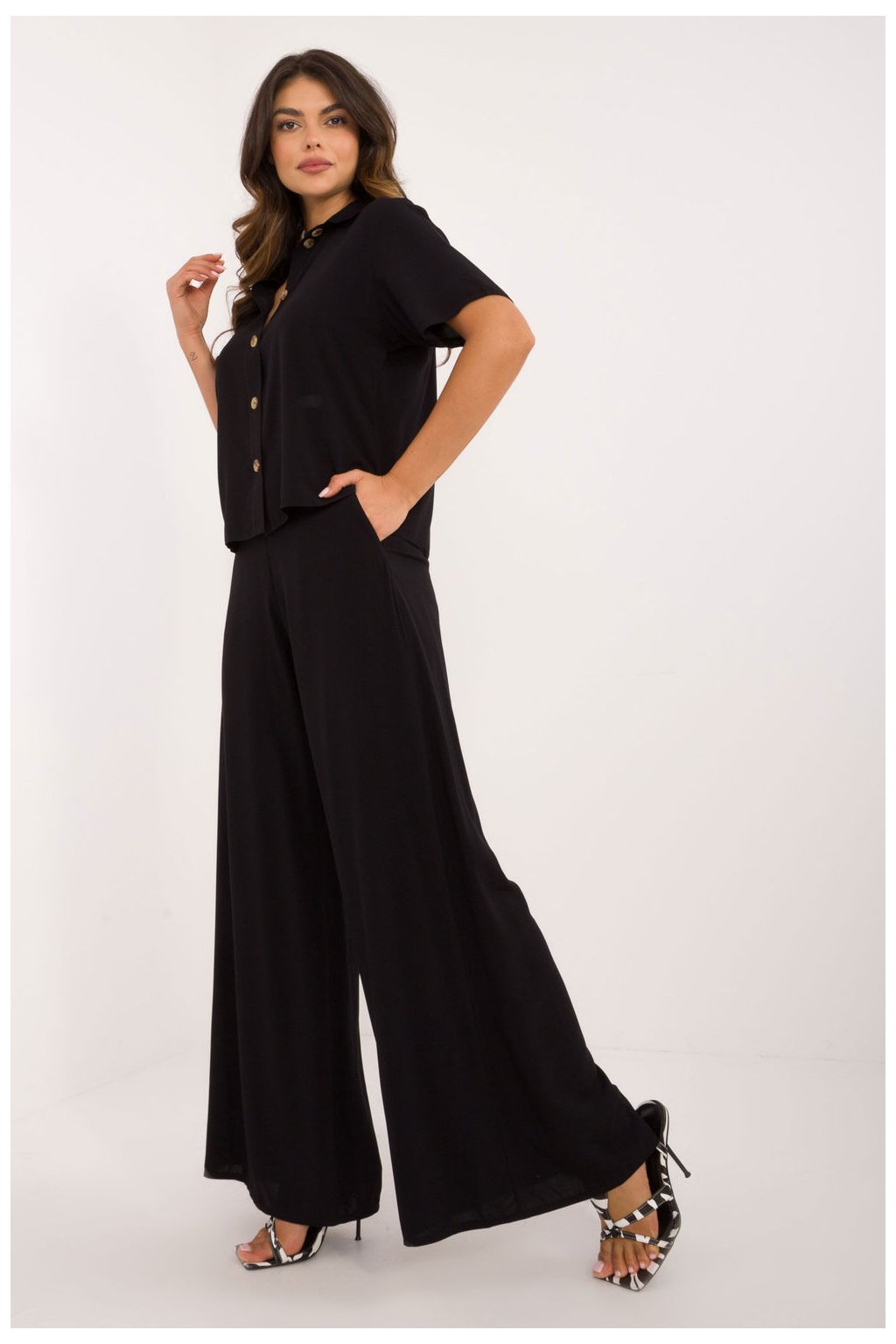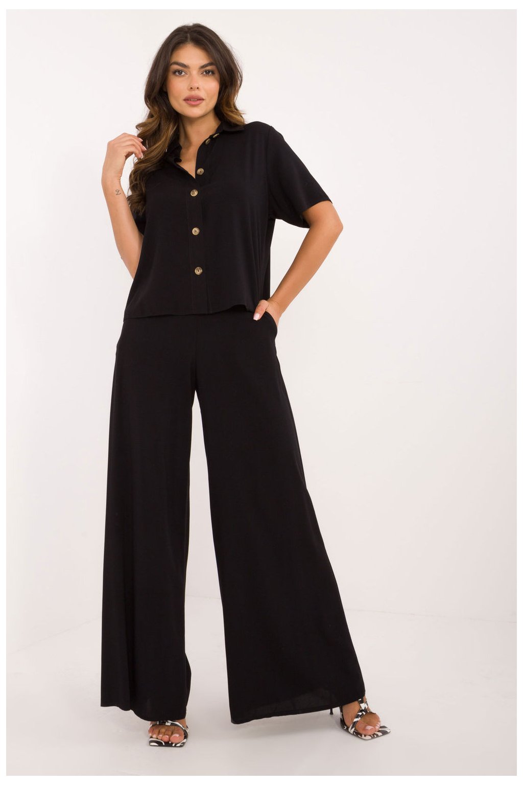 Elegantní a pohodlný set, který skvěle kombinuje volný styl s nádechem elegance. Vyrobený z lehké a prodyšné viskózy, poskytuje pohodlí po celý den, ideální pro každodenní nošení i do práce. Košile s klasickým střihem má krátký rukáv, límeček a zapínání na knoflíky, co jí dodává nadčasový charakter. Široké kalhoty s vysokým pasem krásně zdůrazňují postavu, a skrytý zip na boku zajišťuje estetické zakončení a pohodlné padnutí. Vsuvné boční kapsy přidávají funkčnost a volný charakter. Hladký vzor a minimalistický design umožňují snadné doplnění různými doplňky, vytvářející stylové kombinace na různé příležitosti. Ideální volba pro ženy, které oceňují pohodlí a nadčasový styl!