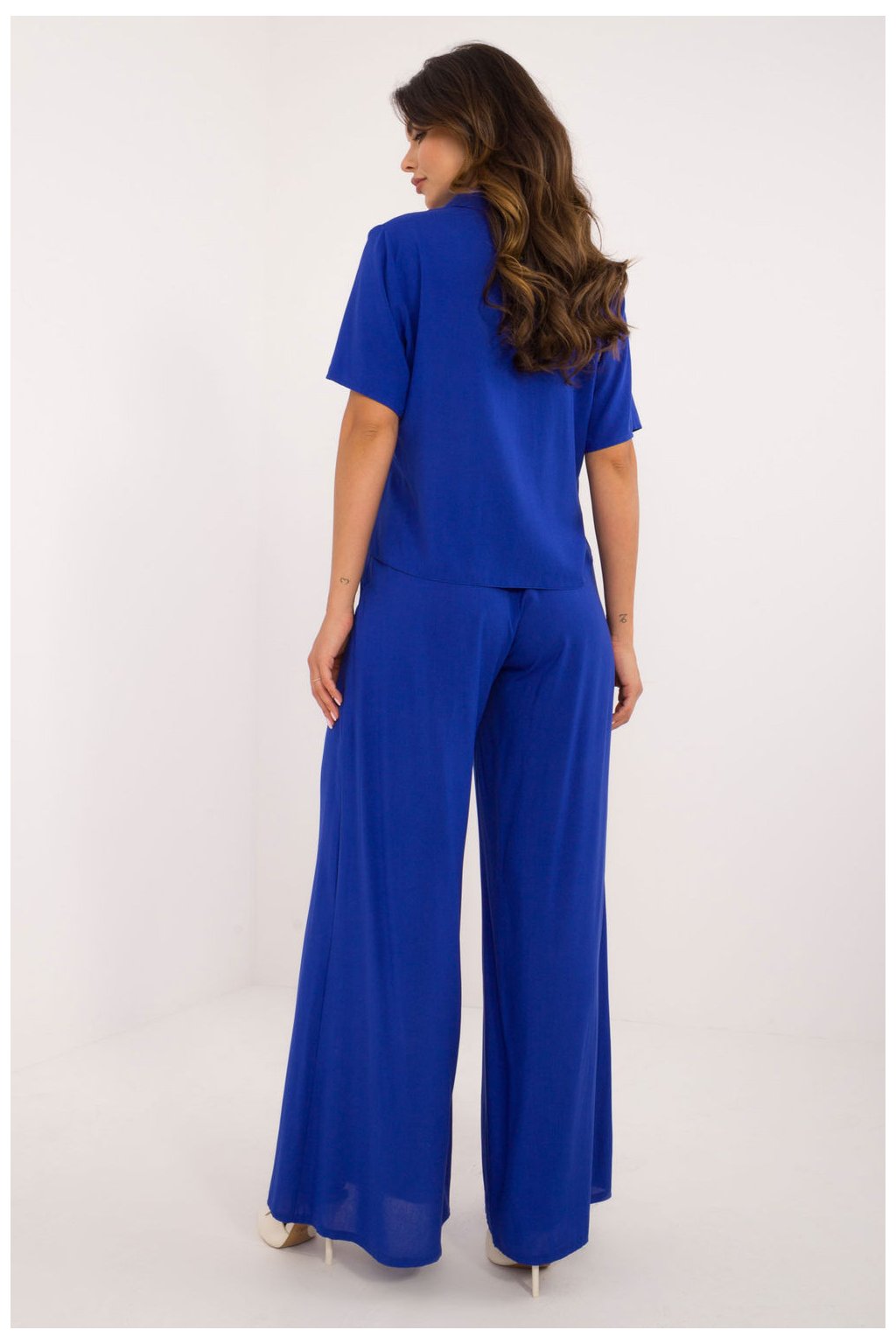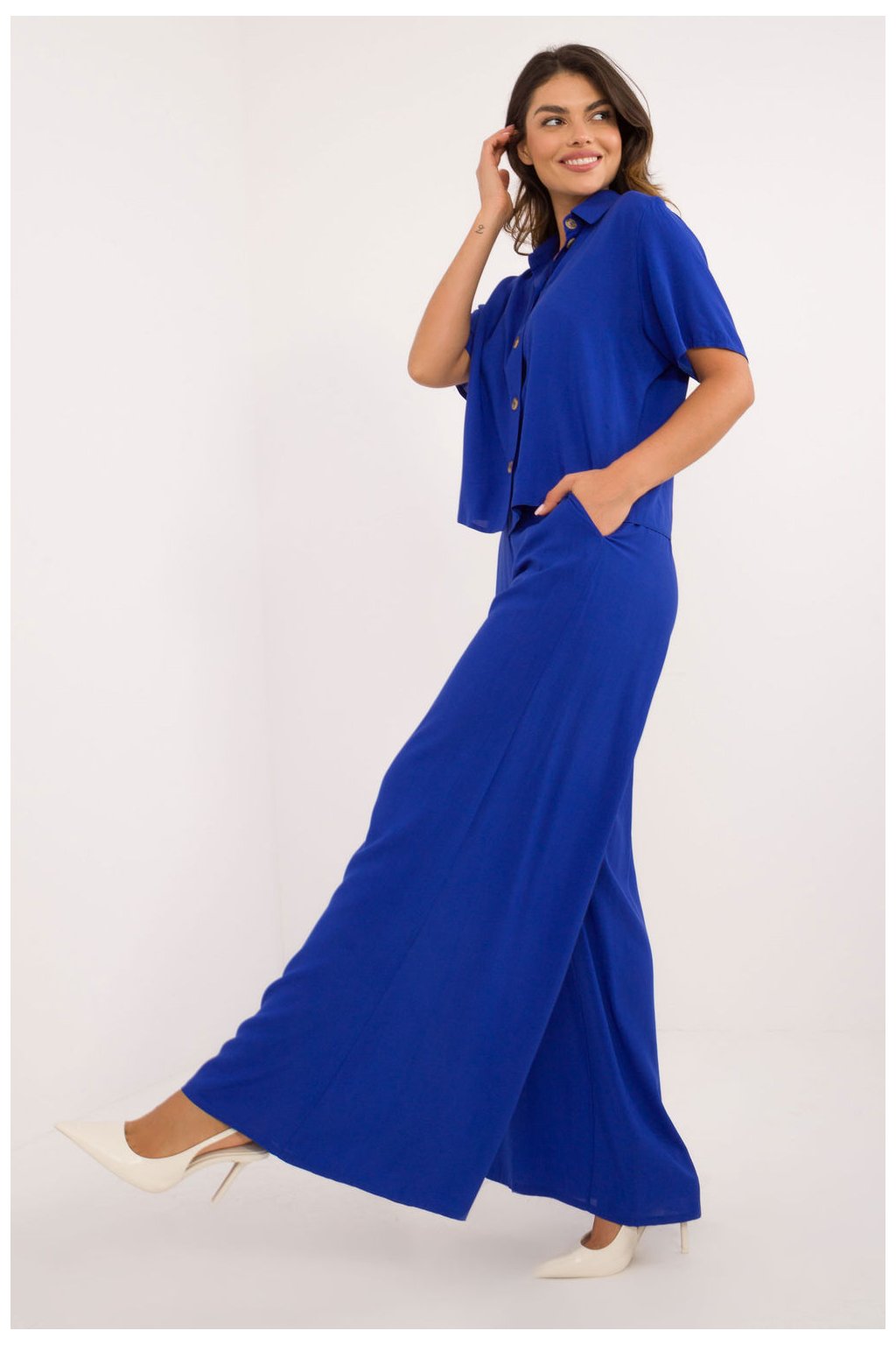 Elegantní a pohodlný set, který skvěle kombinuje casual styl s nádechem elegance. Vyrobený z lehké a prodyšné viskózy, poskytuje pohodlí po celý den, skvěle se hodí jak do práce, tak na volný čas. Košile klasického střihu má krátký rukáv, límeček a zapínání na knoflíky, co jí dodává nadčasový charakter. Široké kalhoty s vysokým pasem krásně zdůrazňují siluetu, a skrytý zip na boku zaručuje estetické dokončení a pohodlné přizpůsobení. Vložené boční kapsy přidávají funkčnost a uvolněný charakter. Hladký vzor a minimalistický design umožňují snadné sladění setu s různými doplňky, vytvářejíce outfit na různé příležitosti. Ideální volba pro ženy, které oceňují pohodlí a nadčasový styl!