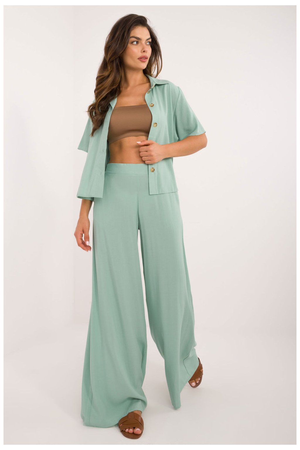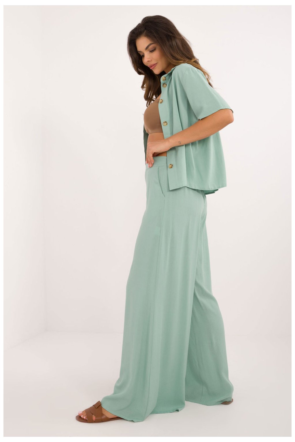 Elegantní a pohodlný set, který skvěle kombinuje casual styl s nádechem elegance. Vyrobený z lehké a prodyšné viskózy, poskytuje pohodlí po celý den, skvěle se hodí do každodenního života i do práce. Košile klasického střihu má krátký rukáv, límeček a zapínání na knoflíky, co jí dodává nadčasový charakter. Široké kalhoty s vysokým pasem krásně zdůrazňují postavu, a skrytý zip na boku zaručuje estetické dokončení a pohodlné nošení. Vložené boční kapsy přidávají funkčnost a uvolněný charakter. Hladký vzor a minimalistický design umožňují snadné kombinování s různými doplňky, vytvářejíce stylizace pro různé příležitosti. Ideální volbou pro ženy, které ocení pohodlí a nadčasový styl!