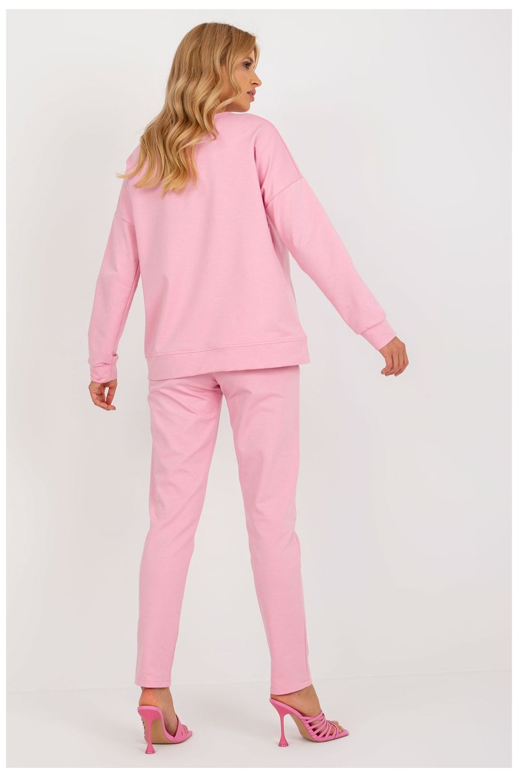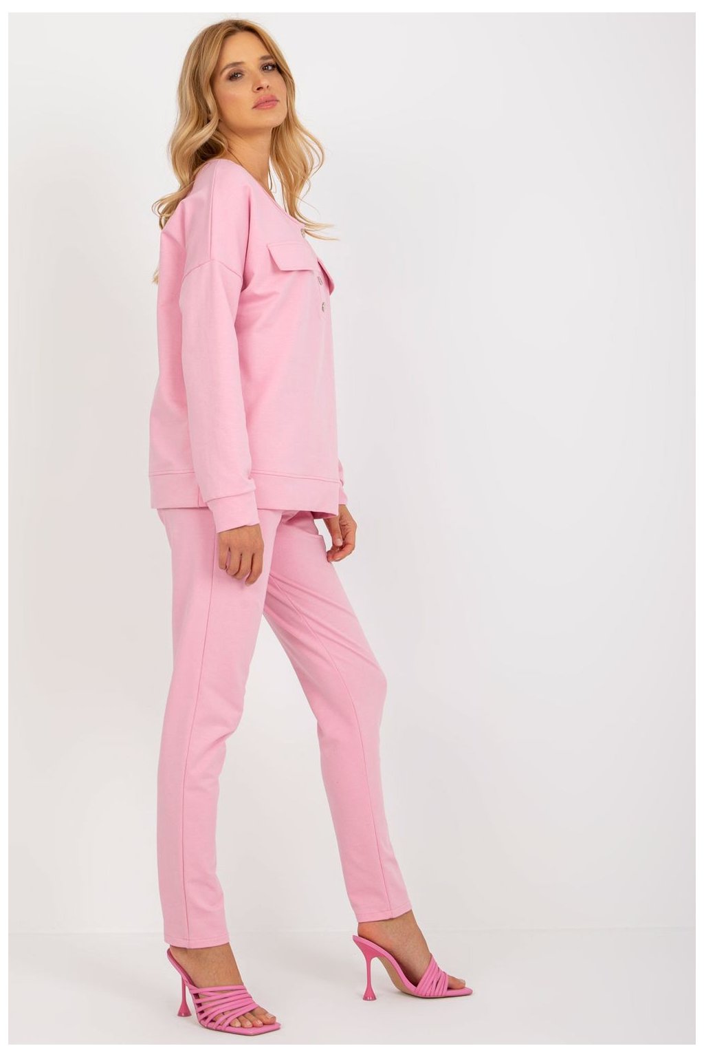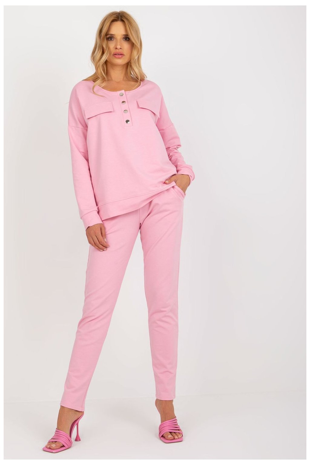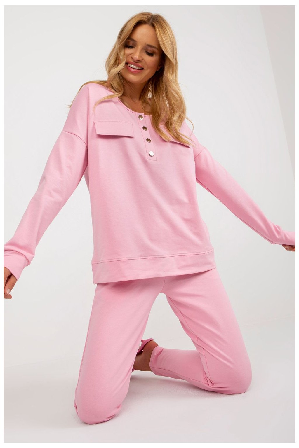 Moderní a pohodlná souprava tepláků, která se skvěle hodí jak do každodenního nošení, tak i do práce. Vyrobena z vysoce kvalitní směsi bavlny a elastanu, poskytuje pohodlí, pružnost a ideální přizpůsobení postavě. Mikina s klasickým střihem má dlouhý rukáv a praktické zapínání na knoflíky vpředu, což jí dodává stylový, minimalistický charakter. Kalhoty s vysokým pasem a přímými nohavicemi zaručují volnost pohybu a pohodlí při nošení po celý den. Vsuvné boční kapsy zvyšují funkčnost soupravy. Hladký vzor a univerzální design z ní dělají skvělý doplněk do každodenního stylu, kombinující pohodlí s elegantním vzhledem. Ideální volba pro ženy, které si cení stylu a pohodlí v každé situaci!