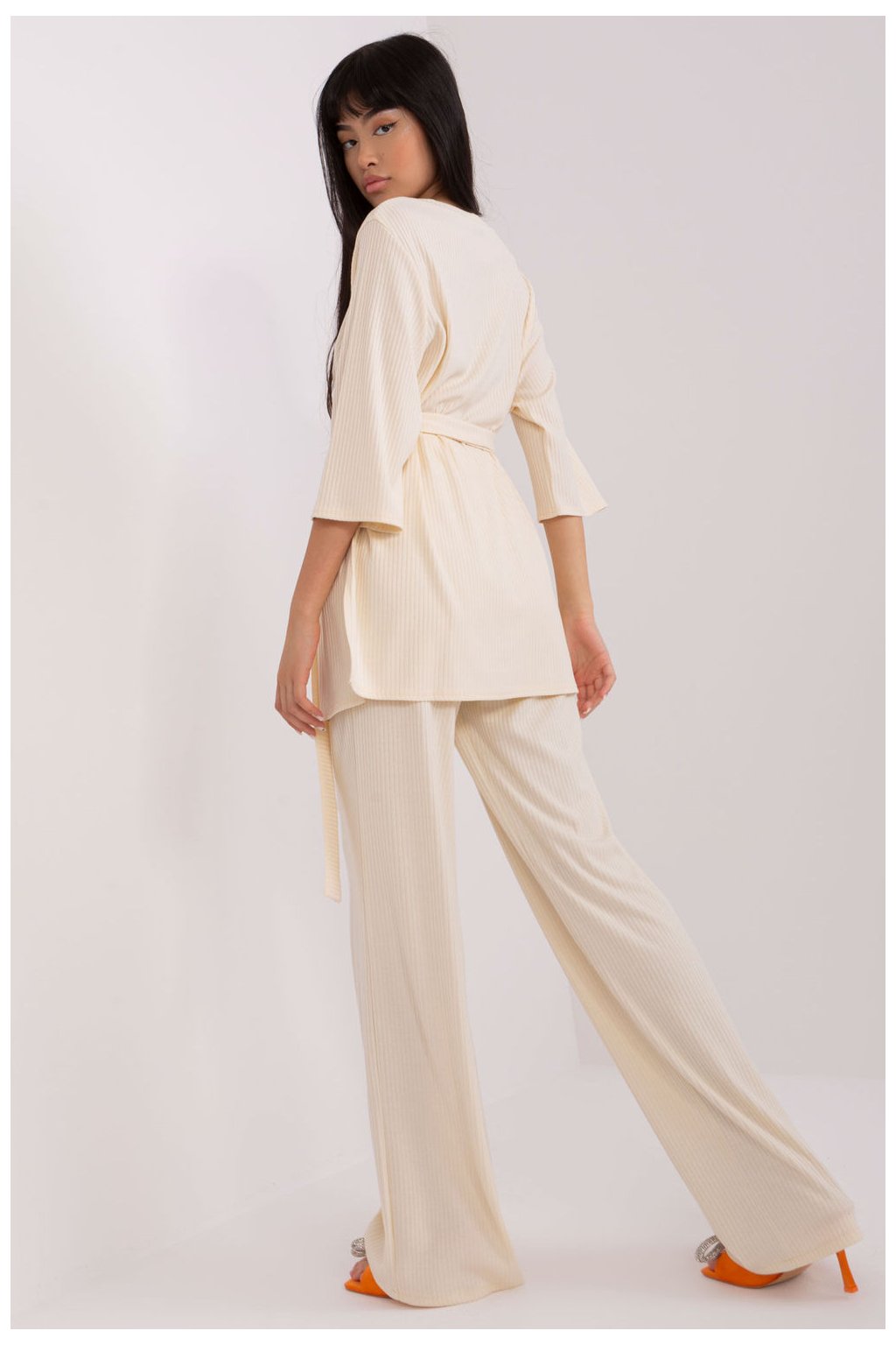Elegantní a pohodlný dámský set z pruhované látky, ideální na každý den. Vyroben z vysoké kvality bavlny s přídavkem elastanu, poskytuje pohodlí a skvělé přizpůsobení postavě. Hladká struktura a decentní proužky mu dodávají moderní, minimalistický charakter. Blůzka s 3/4 rukávem má klasický, univerzální střih, který skvěle ladí se širokými kalhotami s vysokým pasem. Další výhodou je pásek k zapínání, který podtrhuje pas a dodává stylizaci elegantní akcent. Boční kapsy zvyšují funkčnost a pohodlí. Je to skvělá volba pro ženy, které ocení ležérní styl, svobodu a módní detaily!