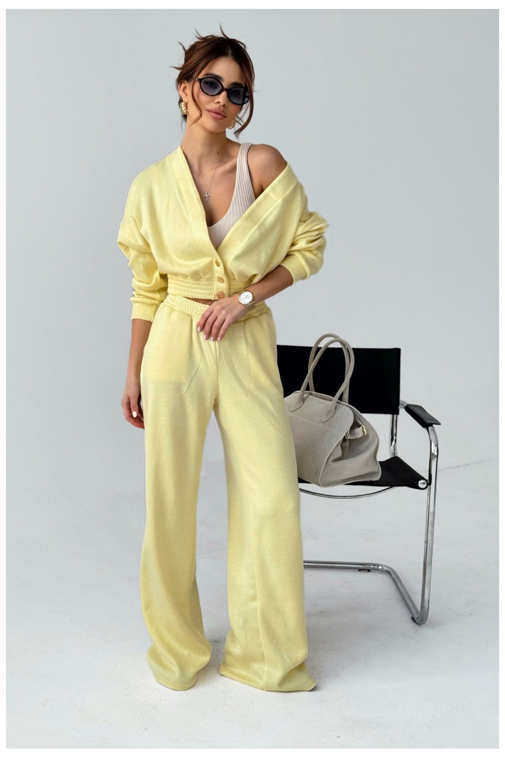 Dámský set je stylové a pohodlné spojení elegance s každodenním pohodlím. Volný svetr s výstřihem do šílenství a zapínáním na knoflíky poskytuje volnost pohybu a skvěle padne na postavě. Široký pružný lem dole dodává strukturu a decentně zdůrazňuje pas. Dlouhé kalhoty s širokými nohavicemi jsou ztělesněním pohodlí a elegance, mají vsunuté kapsy na bocích a elastický pásek, což zaručuje ideální přizpůsobení. Vyrobený z měkkého, příjemného na dotek materiálu, set se hodí jak na každý den, tak i do více elegantních stylizací. Můžete ho nosit společně nebo kombinovat s jinými kousky oblečení, vytvářející nekonečné módní kombinace.