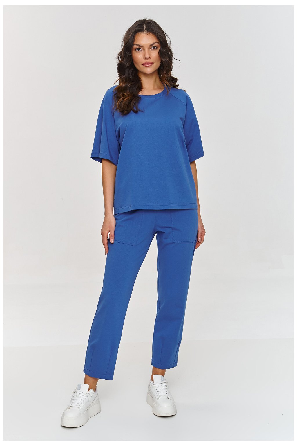 Tento pohodlný teplákový set je ideální volbou pro každodenní styling a aktivní odpočinek. Má volný top s kulatým výstřihem zakončeným jemným lemem a raglánovými rukávy skvělé pro ty, kteří chtějí upravit linii ramen. Klasické kalhoty s přímými nohavicemi mají v pase všitý lem, který umožňuje přizpůsobení se postavě a velké nášivky kapes dodávají stylový akcent a funkčnost. Tento spoj prvků šatníku vytváří harmonický a pohodlný celek. Jednoduchý a volný střih tohoto setu z něj činí nadčasový a univerzální s dodržením volnosti a módního vzhledu. Teplákový set je vyroben z prodyšného bavlněného materiálu, což ho činí praktickým i během teplejších dnů. Tento set se ideálně hodí na každodenní vycházky, nákupy, setkání s přáteli nebo jiné fyzické aktivity. Tento teplákový set je spojením funkčnosti a stylu, ideální pro ty, kteří chtějí být pohodlní, aniž by ztratili módní vzhled.