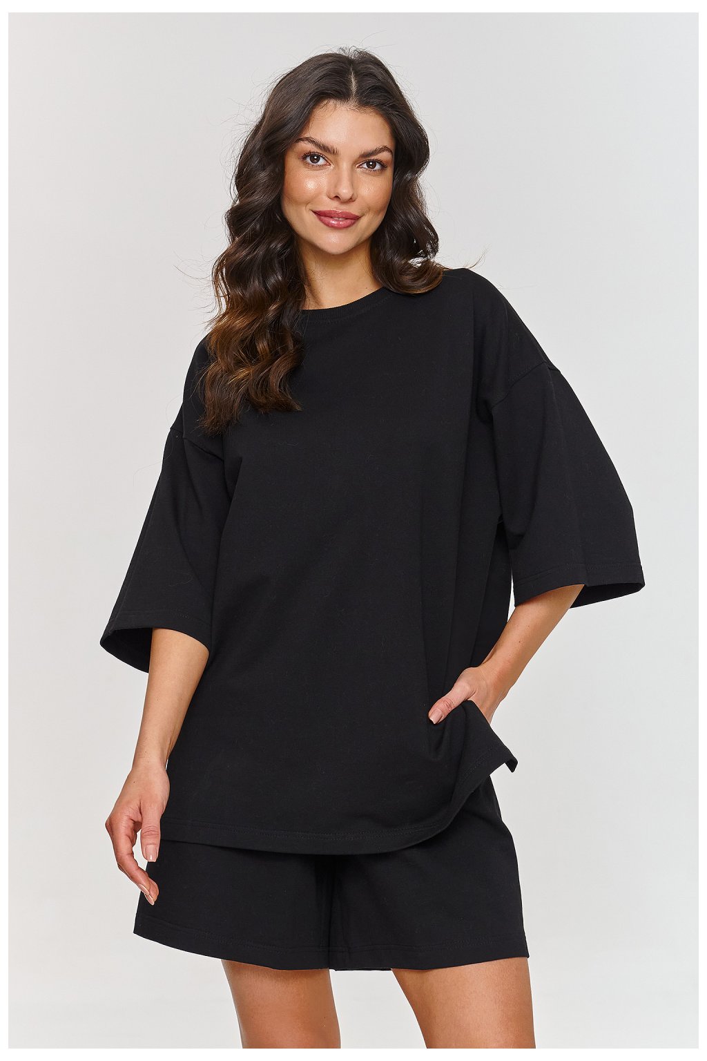 Tento pohodlný teplákový set je ideálním řešením pro ženy, které ocení pohodlí a nadčasovost ve svých každodenních stylizacích. Přesný střih trička zaručuje plnou volnost pohybu a módní vzhled. Krátký rukáv a klasický kulatý výstřih z něj činí ideální nezávaznou základnu pro každodenní stylizace. Kraťasy mají elastický pas, co zajišťuje správné přizpůsobení a boční kapsy zdůrazňují jejich funkčnost. Volný střih kalhot a široké nohavice zaručují plnou volnost pohybů a kratší délka je ideální pro teplé dny. Jednoduchý, ale efektní teplákový set spojuje minimalistický design s pohodlím a vytváří skvělou volbu pro každodenní stylizace. Je to must-have pro relaxaci doma, setkání s přáteli nebo krátké výlety. Jeho univerzálnost však umožňuje také využití při různých fyzických aktivitách.
