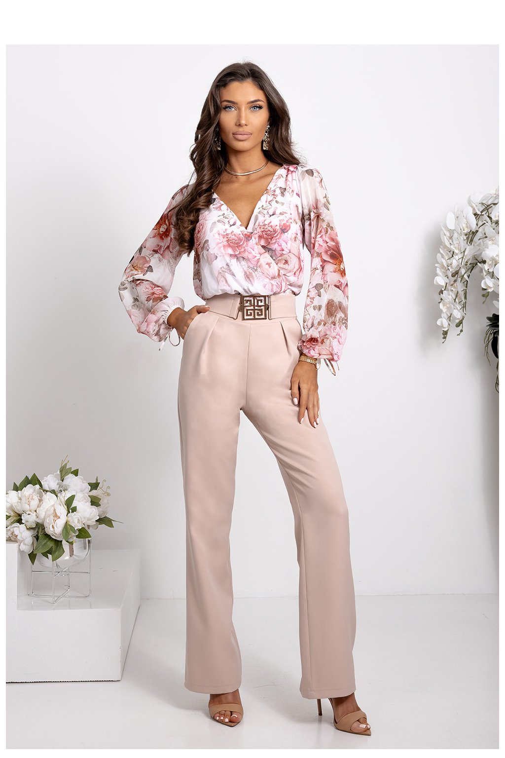 Elegantní a stylový komplet v odstínech béžové barvy, ideální na každou příležitost. Letmý top s jemným květinovým vzorem přidává ženský šarm a jeho decentní béžové tóny zdůrazňují klasický charakter stylizace. Kalhoty v jednobarevném béžovém provedení skvěle ladí s vrchní částí, zajistí harmonický a souvislý vzhled. Celkový dojem dokresluje elegantní pásek s ozdobnou přezkou, který zdůrazňuje pas a přidává eleganci. Tento set je kombinací pohodlí a nadčasové elegance, ideální na každodenní nošení i na speciální příležitosti.Velikost | Délka | Obvod beder | Obvod prsou | Obvod v pase |