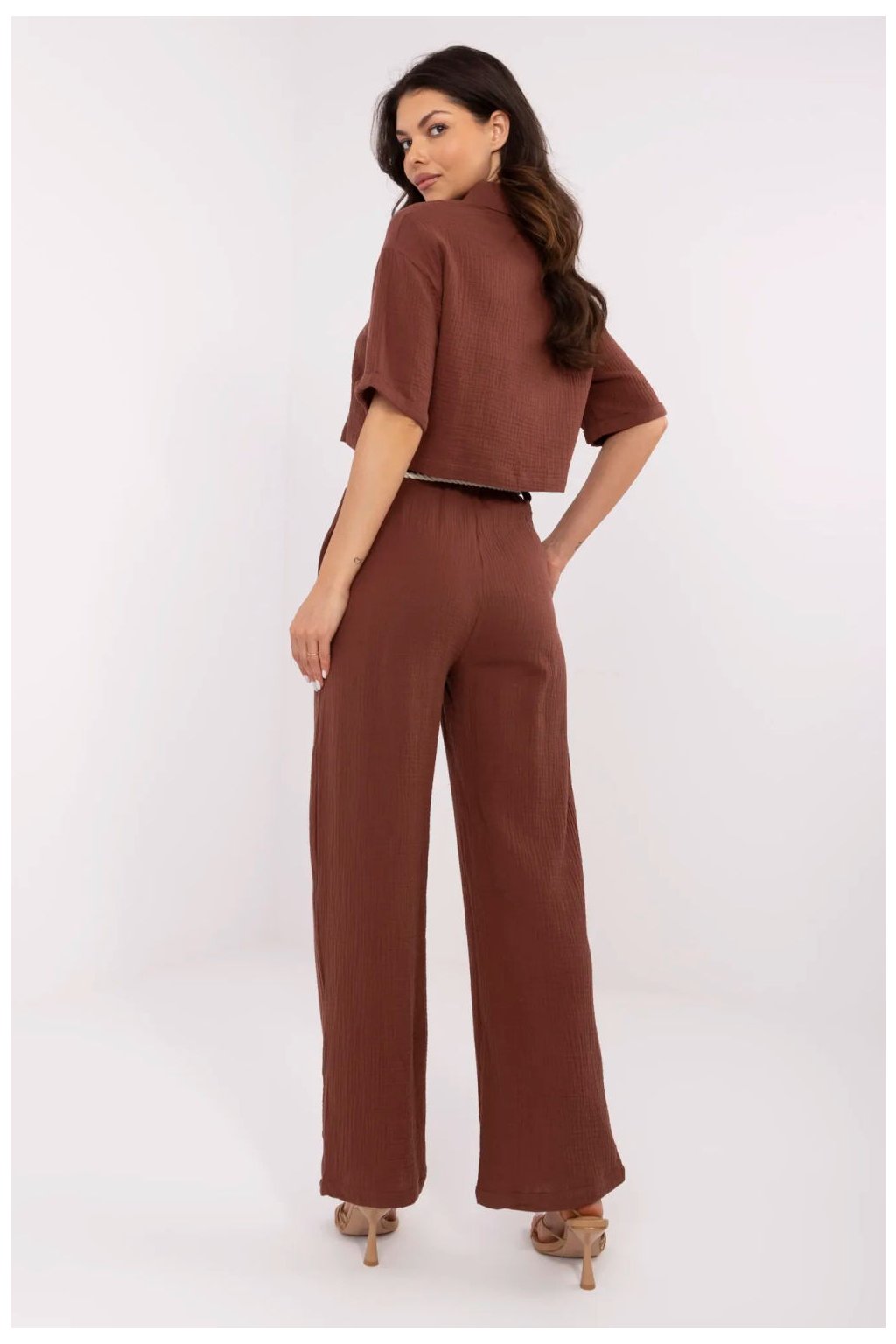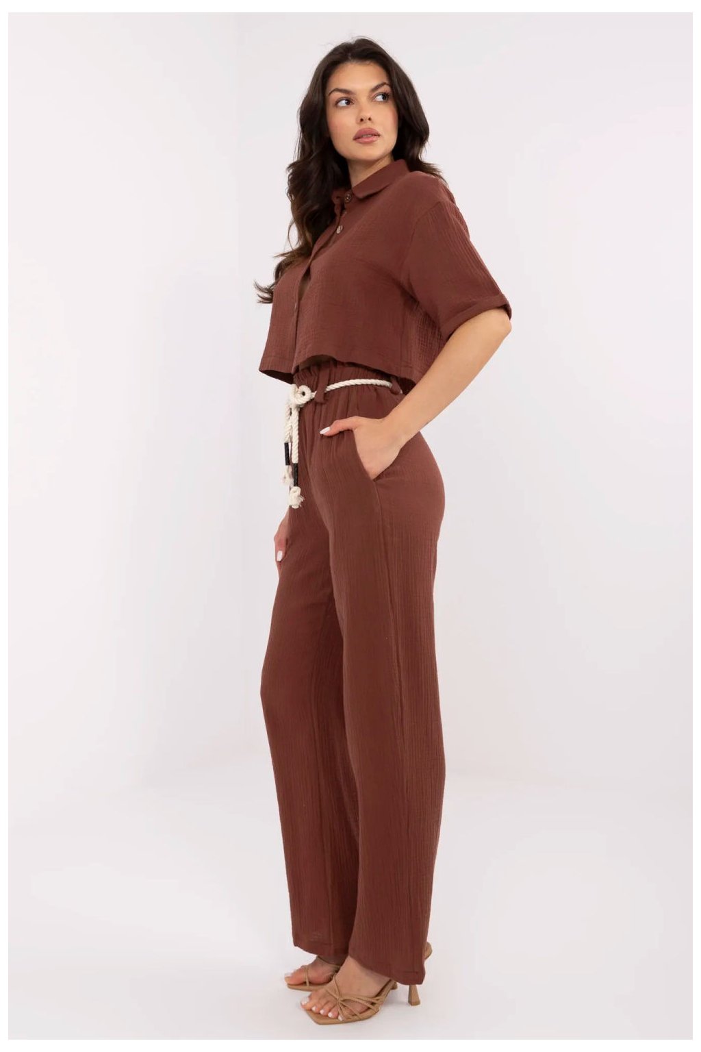 Dámský set s košilí a kalhotami je stylový a pohodlný návrh v casualovém provedení, ideální na každý den. Vyrobený z prodyšné a přírodní směsi lnu a viskózy, zajišťuje pohodlí i v teplejších dnech. Součástí setu je košile s krátkým rukávem, klasickým límcem a zapínáním na knoflíky, která vypadá lehce a nadčasově. Kalhoty s vysokým pasem a přímými nohavicemi byly vybaveny vloženými bočními kapsami a páskem k převázání v pasu, který zdůrazňuje siluetu a přidává ženský akcent. Hladká tkanina a minimalistický střih dělají set mimořádně univerzálním, skvěle se hodí na procházku, nákupy nebo volný den v práci. Přírodní vzhled a ležérní móda!