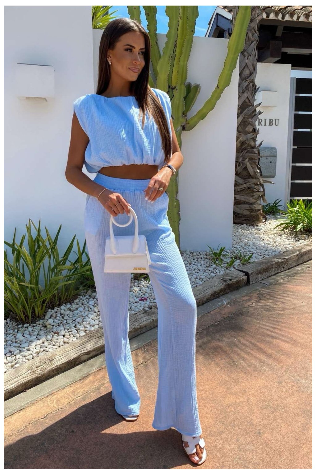 Kompletní mušelínový set je skvělou kombinací pohodlí a stylu. Lehký bezrukávový top je zakončen elastickou gumou dole, díky čemuž se skvěle přizpůsobuje postavě a poskytuje pohodlí při nošení. Dlouhé kalhoty s měkkým gumovým pásem zaručují volnost pohybu a vložené kapsy přidávají praktičnost. Celkově vyrobeno z prodyšného mušelínu se ideálně hodí na teplé dny, vytvářejíc ženský a přirozený vzhled.Doplňkové parametry