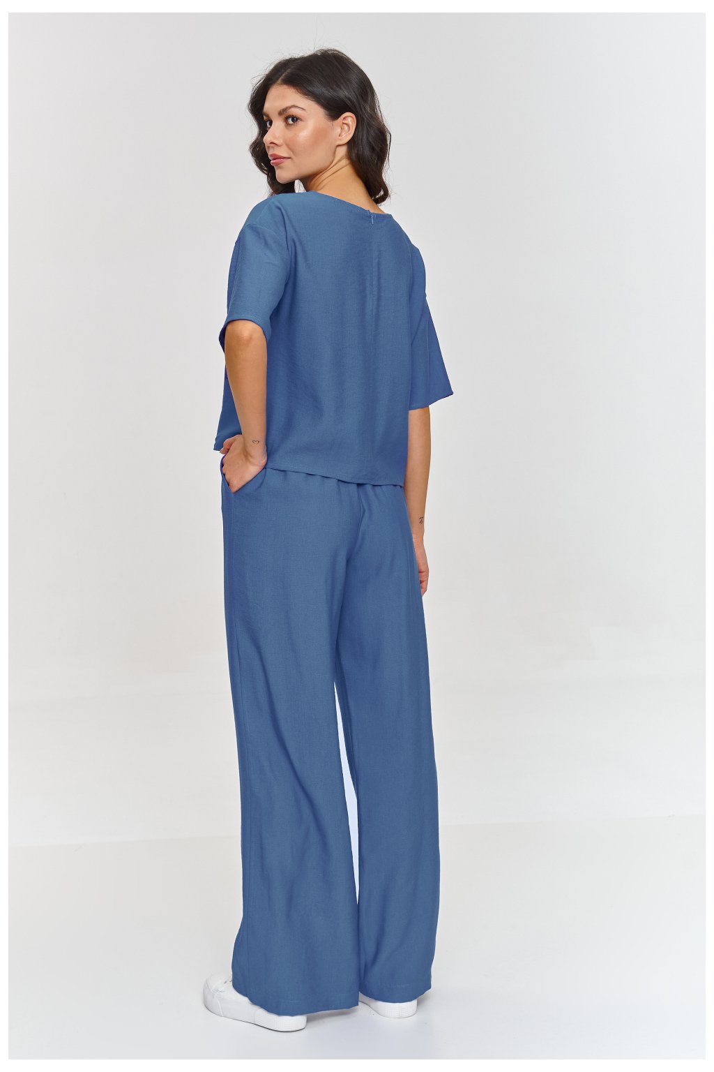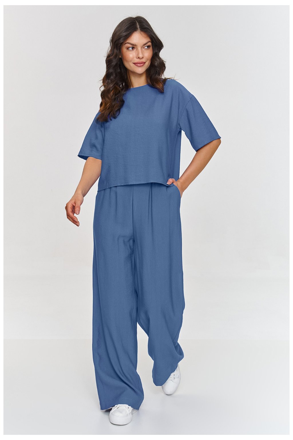 Tento elegantní set je ideální nabídkou na jarní a letní dny, kdy chcete spojit módní vzhled s vysokou kvalitou provedení. Sada obsahuje volnou blůzu ve tvaru kostky, která skvěle ladí s elegantními stylizacemi. Krátký rukáv a jednoduchý střih blůzy z ní činí skvělou volbu pro formální i méně formální události, spojující eleganci s pohodlím. Kalhoty se vyznačují širokými nohavicemi, které stylizaci dodávají moderní a elegantní vzhled. Elastický pas zajišťuje pohodlné nošení a jejich délka přidává celku eleganci a stylu. Model je vyroben z jemného a lehkého materiálu imitujícího len. Jednoduchý, ale vysoce rafinovaný střih dává setu nadčasový charakter, který bude vypadat stylově na každé postavě. Sada se skvěle hodí na obchodní schůzky, elegantní události nebo výlety do města, kdy záleží na spojení elegance a volnosti. Můžete ji kombinovat se špičatými botami, elegantními sandály nebo bílými teniskami.