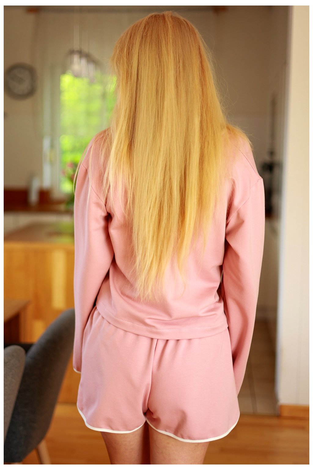 Kompletní Alex je třídílný dres vyrobený z bavlněné pleteniny s přídavkem elastanu. Volné kalhoty, kraťasy a mikina s charakteristickým lemem tvoří soubor, který potěší ženy, které kladou důraz především na pohodlí. Mikina s dlouhým rukávem a výstřihem do V, k ní dlouhé kalhoty s gumou v pasu a kapsami všitémi. Kraťasy s gumou v pasu s nohavicemi zakončenými do půlkruhu. Oversize střih a měkká pletenina jsou ideální kombinací, která se hodí nejen při sportovních aktivitách, ale také v každodenních stylizacích. Délka 80 cm a 7,5 cm v tabulce se týká vnitřní délky kalhot a kraťasů.