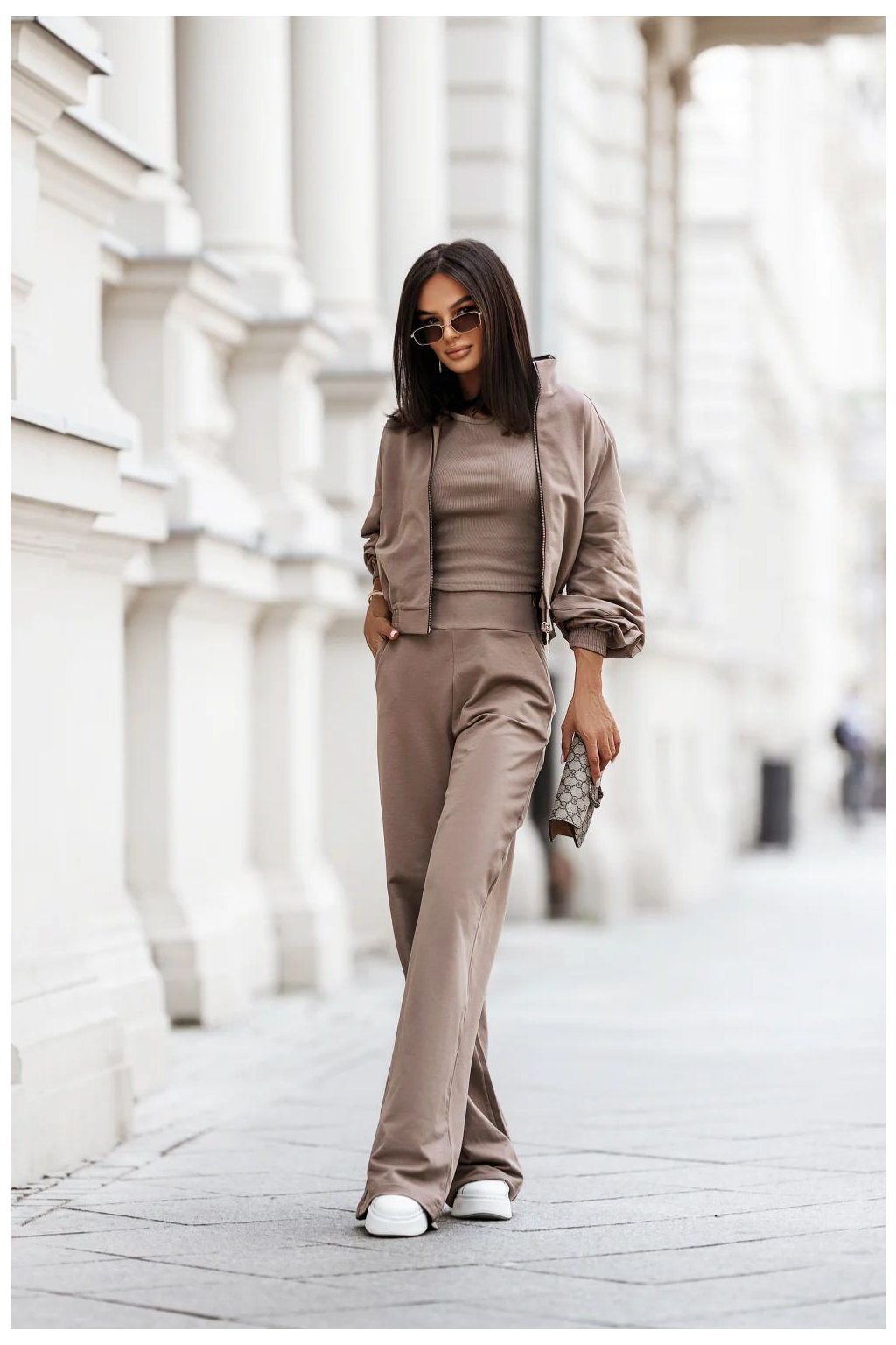 Kompletní bavlněný set je stylový a pohodlný návrh, ideální jak na každý den, tak i na více neformální příležitosti. Součástí setu jsou tři kusy. Mikina s zipem, zakončená stojacím límcem, s rukávy a spodkem zakončenými elastickými lemy, které jí dodávají sportovní charakter a zajišťují pohodlné nošení. Krátké topy na tenkých ramínkách, vyrobené z pruhované látky, s klasickým kulatým výstřihem. Skvěle sedí a zdůrazňuje postavu. Dlouhé kalhoty s vysokým pasem, zapínající se po stranách na skrytý zip. Mají praktické kapsy a rozšiřující se nohavice, které dodávají lehkost a zapadají do aktuálních trendů. Set kombinuje volnost a ženský styl, hodí se do mnoha každodenních stylizací.
