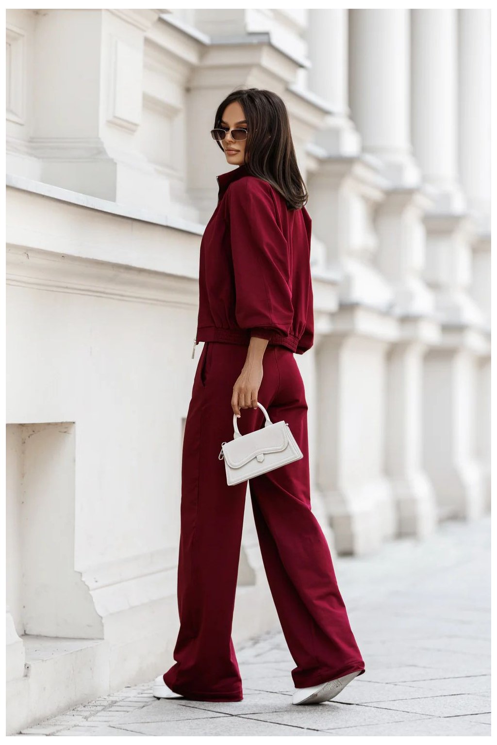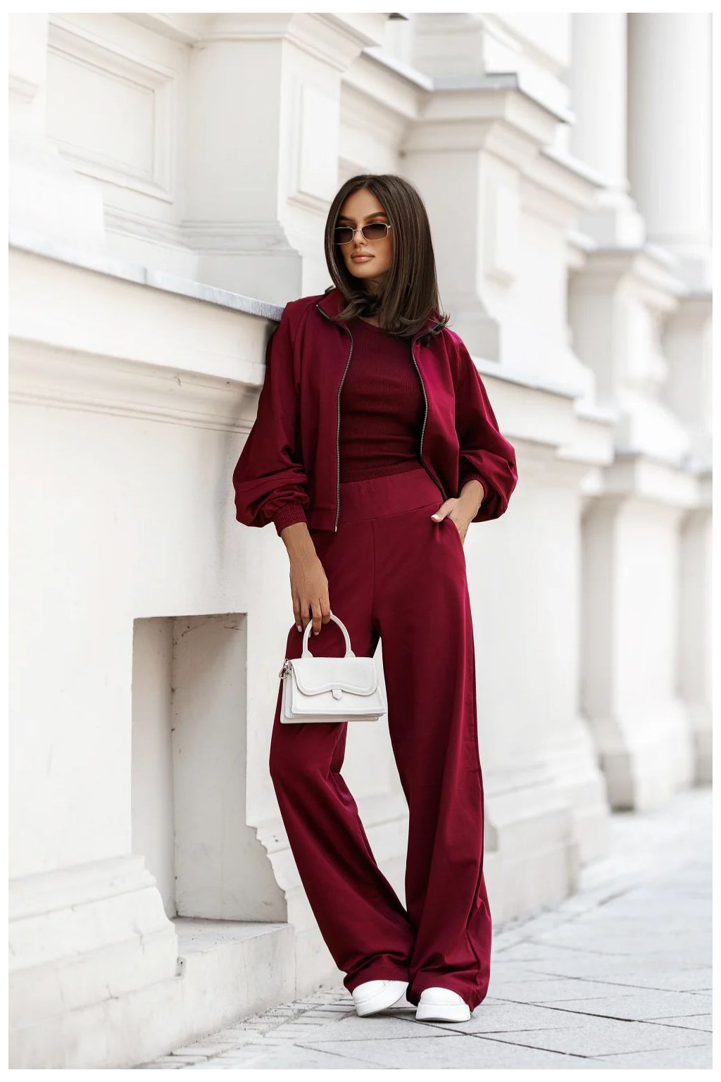 Sada z bavlny je stylový a pohodlný návrh, ideální jak na každý den, tak i na více příležitostí. Sada obsahuje tři kusy. Mikina se zapínáním na zip, dokončená stojkou, s rukávy a spodkem zakončenými elastickými lemy, které jí dodávají sportovní charakter a zajišťují pohodlí při nošení. Krátké topy s tenkými ramínky, vyrobené z pruhovaného materiálu, s klasickým kulatým výstřihem. Skvěle padne k postavě, zdůrazňující její výhody. Dlouhé kalhoty s vysokým pasem, zapínání po stranách na skrytý zip. Mají praktické kapsy a rozšiřující se nohavice směrem dolů, které dodávají lehkost a zapadají do současných trendů. Sada kombinuje volnost a ženský styl, osvědčující se v mnoha každodenních stylizacích.