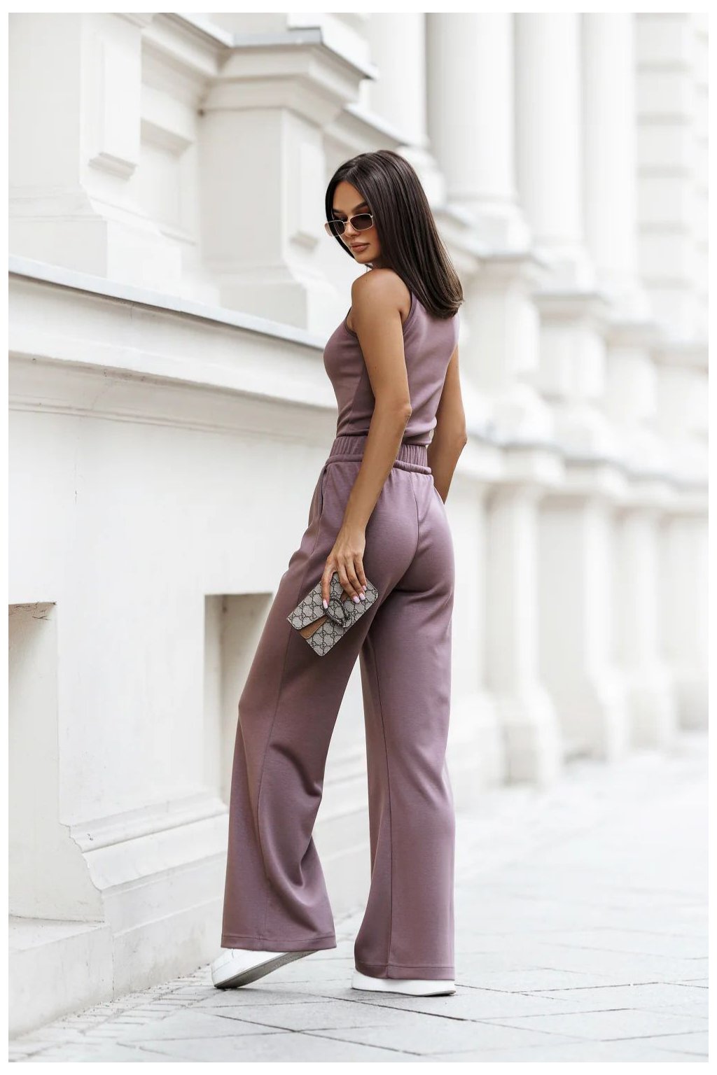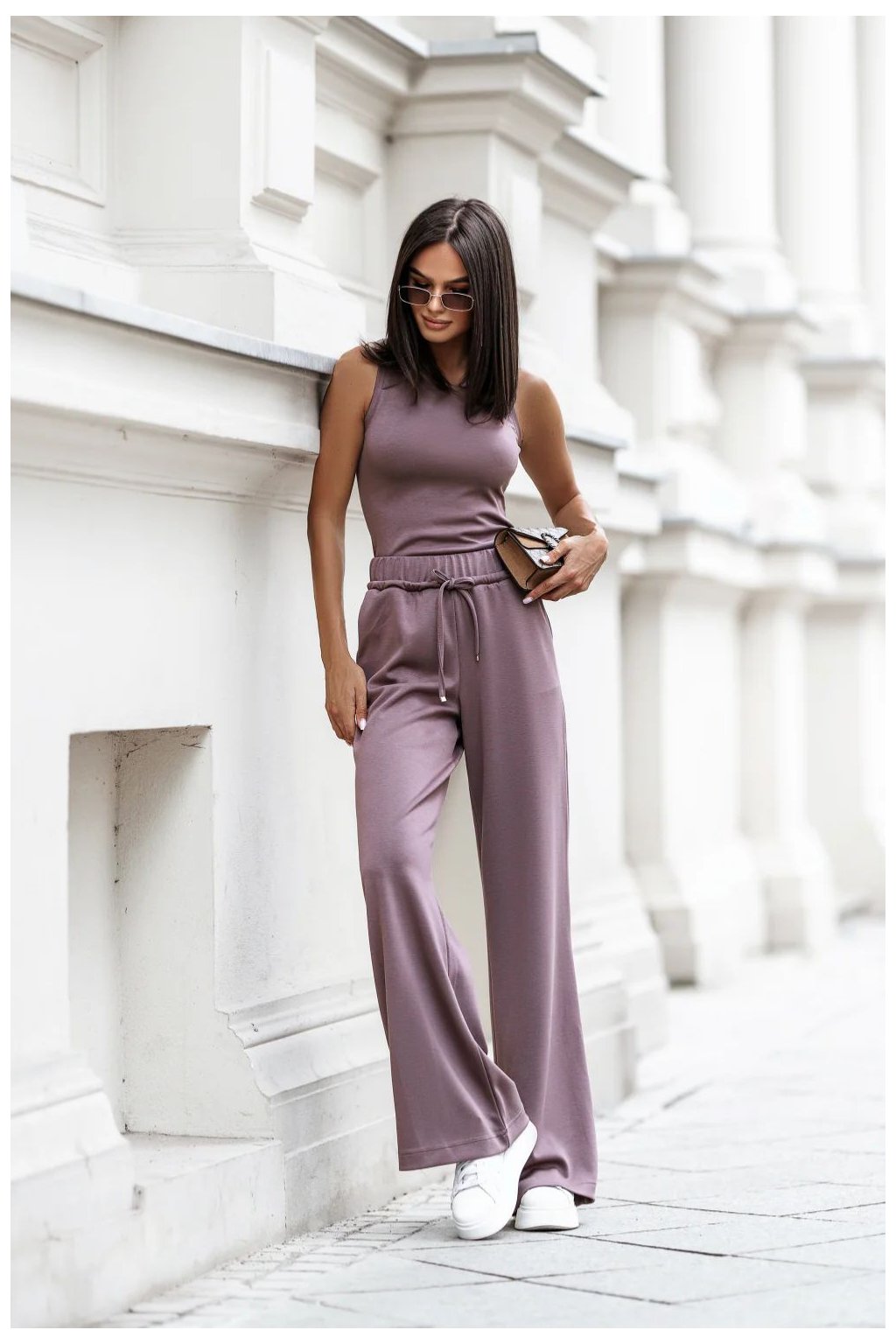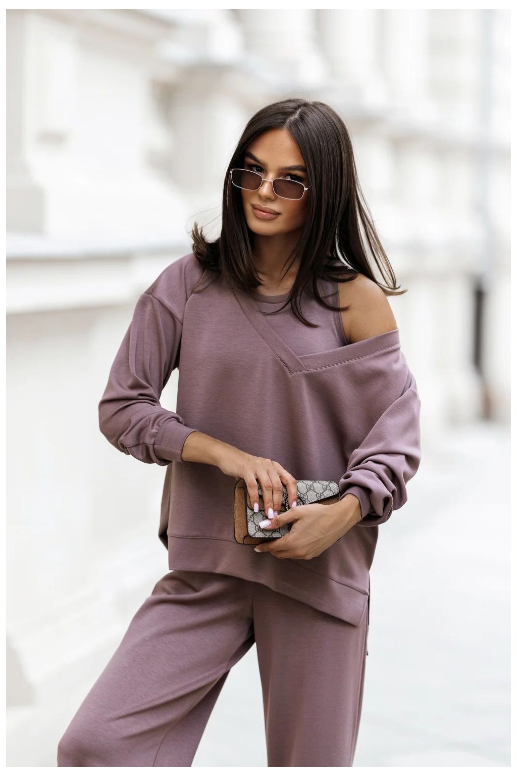 Stylový dámský komplet vytvořený s ohledem na pohodlí a ženský vzhled. Skládá se ze tří perfektně padnoucích prvků. Mikina s dlouhým rukávem a výstřihem do V, který jemně zdůrazňuje linii krku. Spodní část mikiny je asymetrická, vzadu trochu delší, což dává celku moderní charakter a zajišťuje volnost pohybu. Tílko na ramínka s klasickým, kulatým výstřihem, tvořící univerzální základ pro mnoho stylizací, ideální k nošení samostatně nebo pod mikinou. Dlouhé kalhoty s pohodlným elastickým pasem a dodatečným šněrováním, které umožňuje individuální přizpůsobení. Vsuvné kapsy zvyšují funkčnost, a nohavice jemně rozšiřující se ke spodku dodávají lehkost a zapadají do módního, volného stylu. Komplet ideální na každý den, spojující pohodlí s ženskou estetikou. Skvěle se hodí jak do domácího útulku, tak do uvolněných městských stylizací.