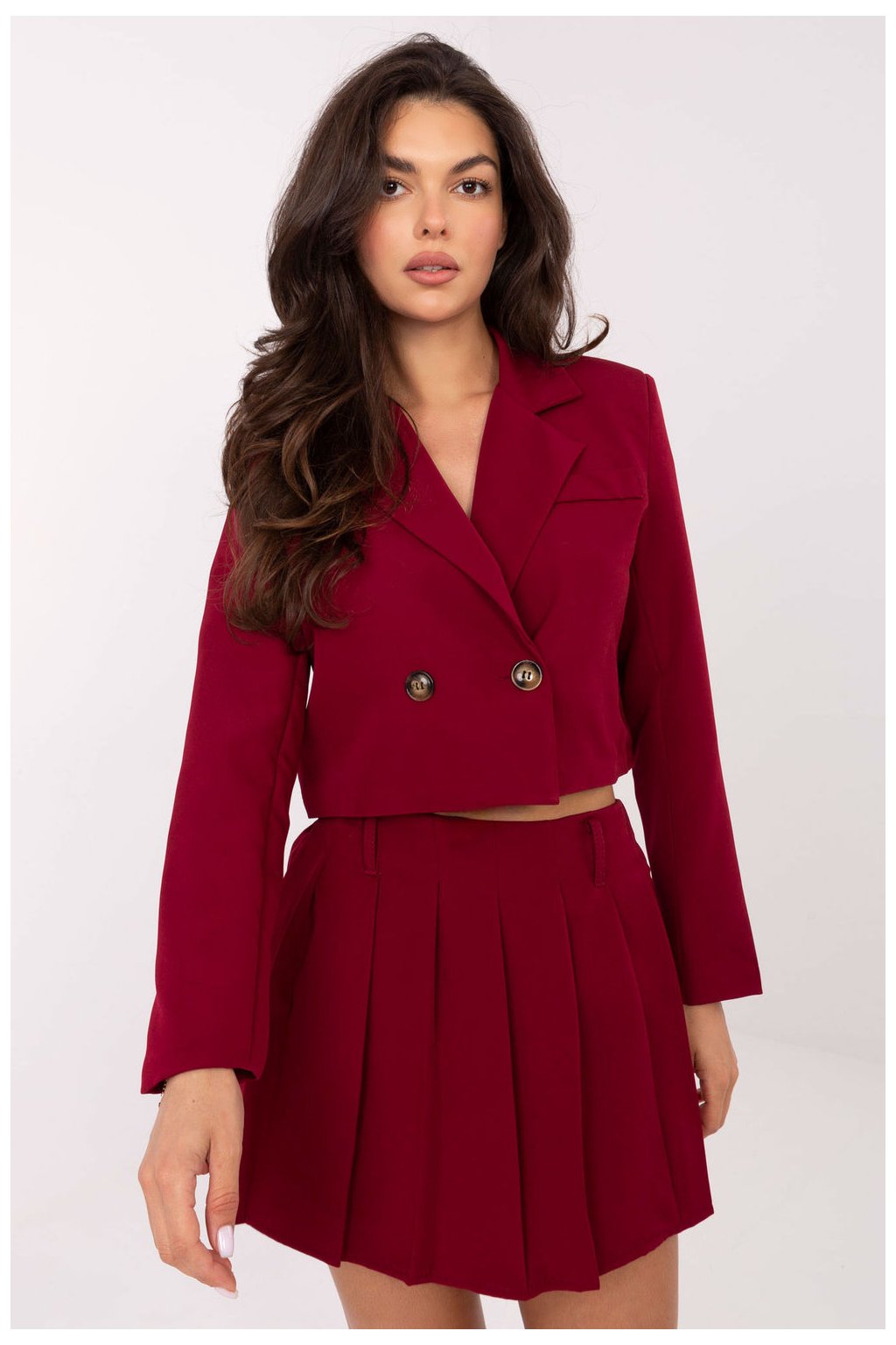 Dámský elegantní set skládající se z krátkého saka a sukně-šortek, ideální pro každodenní nošení, práci a setkání. Sako s límečkem, zapínání na knoflík, s vloženými polštářky na ramenou. Sukně-šortky mají skládaný přední díl a vložené kraťasy, které zajistí pohodlí a plnou volnost pohybu, a na zadní straně jsou vsazeny gumu pro lepší přizpůsobení. Vyrobeno z polyesterové směsi a elastanu, s hladkým vzorem, set spojuje eleganci s pohodlím nošení. Dlouhý rukáv saka a mini délka sukně-šortek dodávají outfitu moderní a ženský charakter. Jedná se o set, který spojuje eleganci, funkčnost a pohodlí, skvěle se hodící do mnoha každodenních i výjimečných stylizací.