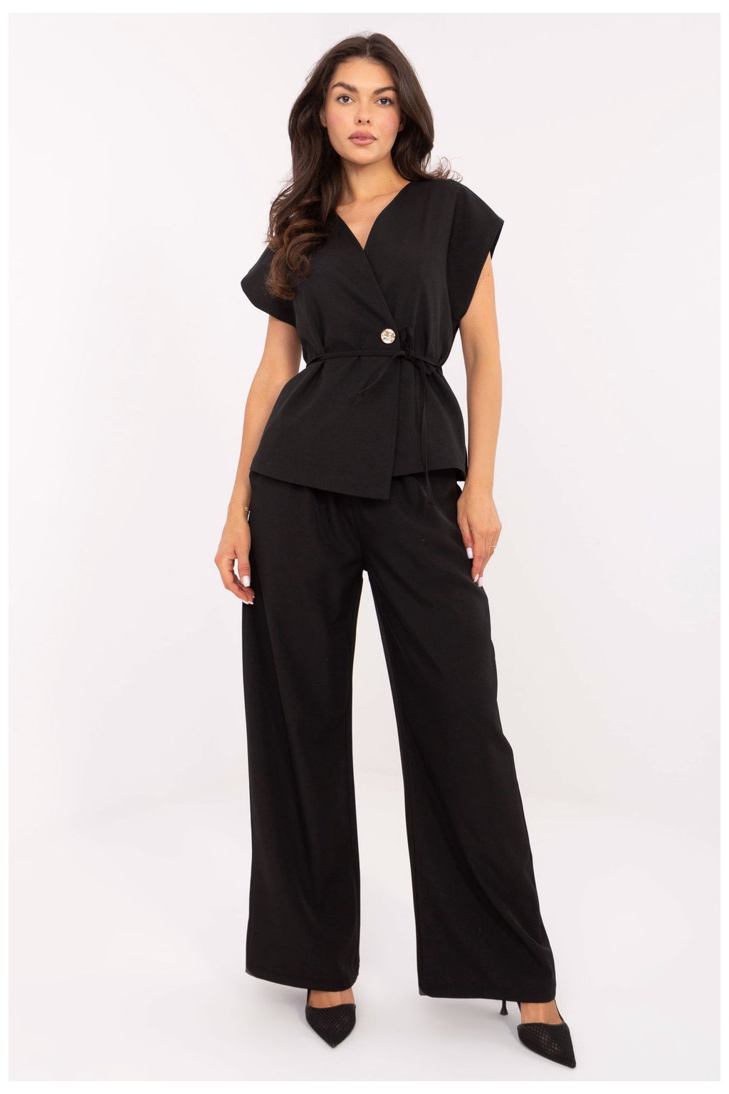 Elegantní dámský set skládající se z vesty a kalhot, skvělý na každý den, do práce a na společenské události. Vyrobený z kombinace viskózy a polyesteru, vyniká hladkou strukturou a klasickým charakterem. Vesta se zapínáním na knoflík má krátký kopertový rukáv a šněrování v pasu, které zdůrazňuje siluetu a dodává ženský půvab. Kalhoty s vysokým pasem s všitou gumou v pase zaručují pohodlí, a široké nohavice dodávají lehkost a eleganci. Boční kapsy umožňují spojení stylu s funkcionalitou, vytvářejíce moderní a nadčasový celek.