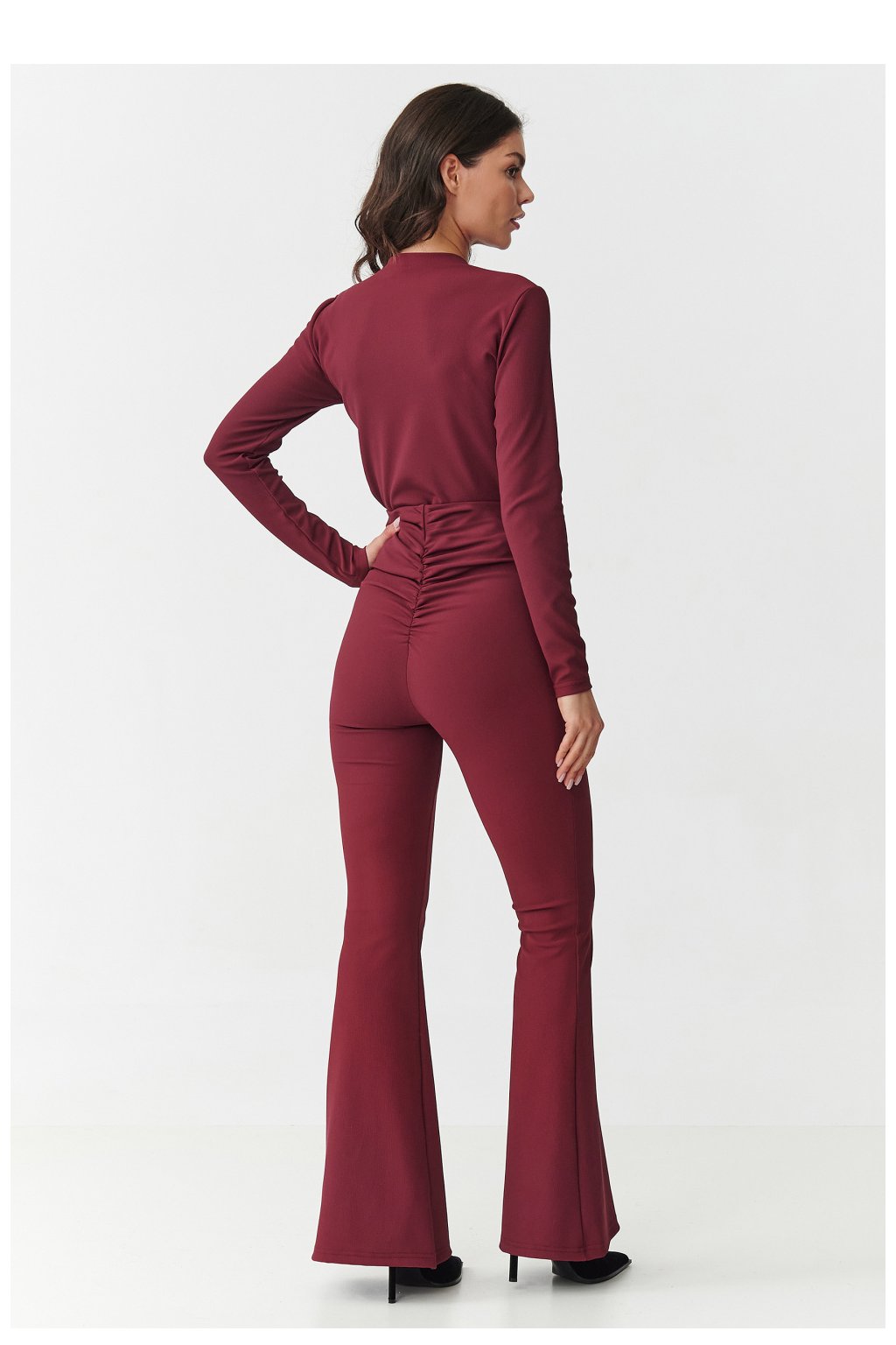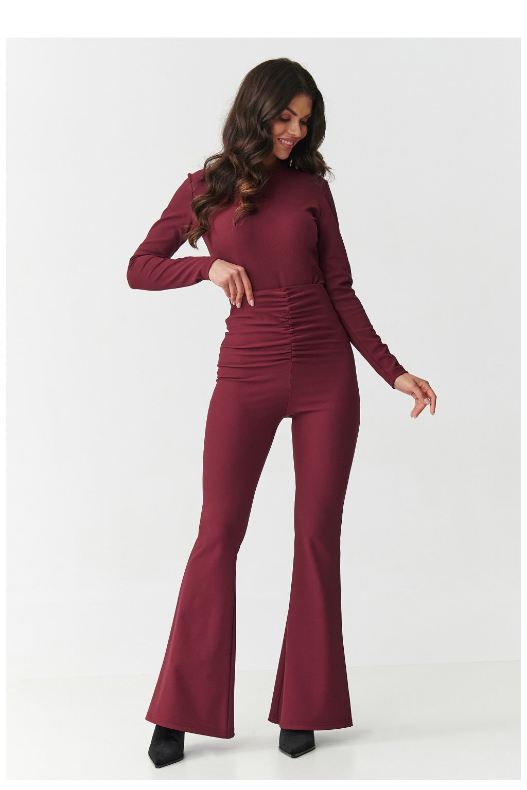 Vsadíte na vzhled, který kombinuje eleganci a pohodlí! Tento jedinečný dámský set se skládá z přiléhavého topu s dlouhým rukávem a kalhot s vysokým pasem a rozšířenými nohavicemi. Vyrobený z vysoké kvality pruhovaného materiálu krásně zdůrazňuje postavu a poskytuje pohodlí po celý den. Top má klasický střih s vysokým dekoltem a zapíná se vzadu na zip, což ho činí pohodlným a zároveň velmi elegantním. Kalhoty s vysokým pasem zdůrazňují pas a tvarují postavu a díky sbírání v pasu dodávají postavě proporce, zatímco rozšířené nohavice typu flare opticky prodlužují nohy. K dispozici v čtyřech nadčasových barvách: bordó ženské a smyslné, černé klasické, které se hodí ke všemu, čokoládové moderní a výrazné, béžové elegantní a decentní. Tento set se hodí na mnoho příležitostí od večerních setkání, přes slavnostní události až po obchodní stylizace. Stačí přidat oblíbené boty na podpatku a šperky, abyste vytvořili efektní a moderní vzhled.