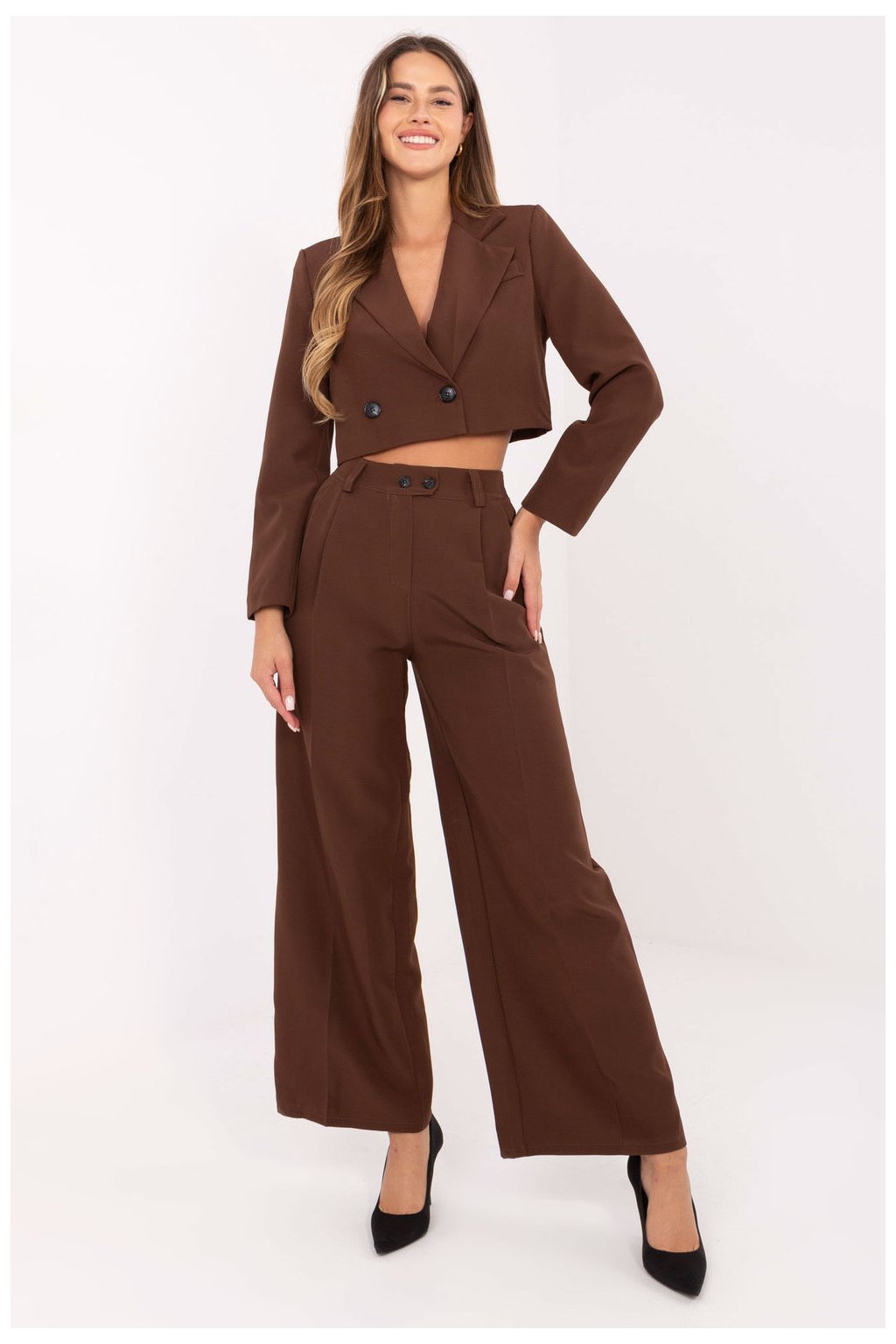 Elegantní dámský set skládající se z krátkého saka a dlouhých kalhot je ideální volbou pro ženy, které ocení spojení elegance a pohodlí. Sako s límci a límečkem se zapíná na knoflík a vestavěné polštářky na ramenou dodávají postavě výraznou, ženskou formu a jemně ji modelují. Kalhoty s dlouhými, širokými nohavicemi a vysokým pasem dokonale zdůrazňují pas a opticky prodlužují nohy. Zapínání na zip a knoflík zaručuje pohodlné nošení a boční kapsy přidávají praktičnost. Set zaujme propracovaným střihem a univerzálním charakterem, skvěle se hodí jak do každodenního života, tak do elegantnějších stylizací. Skvělá volba do kanceláře, na schůzku nebo večerní vycházku.