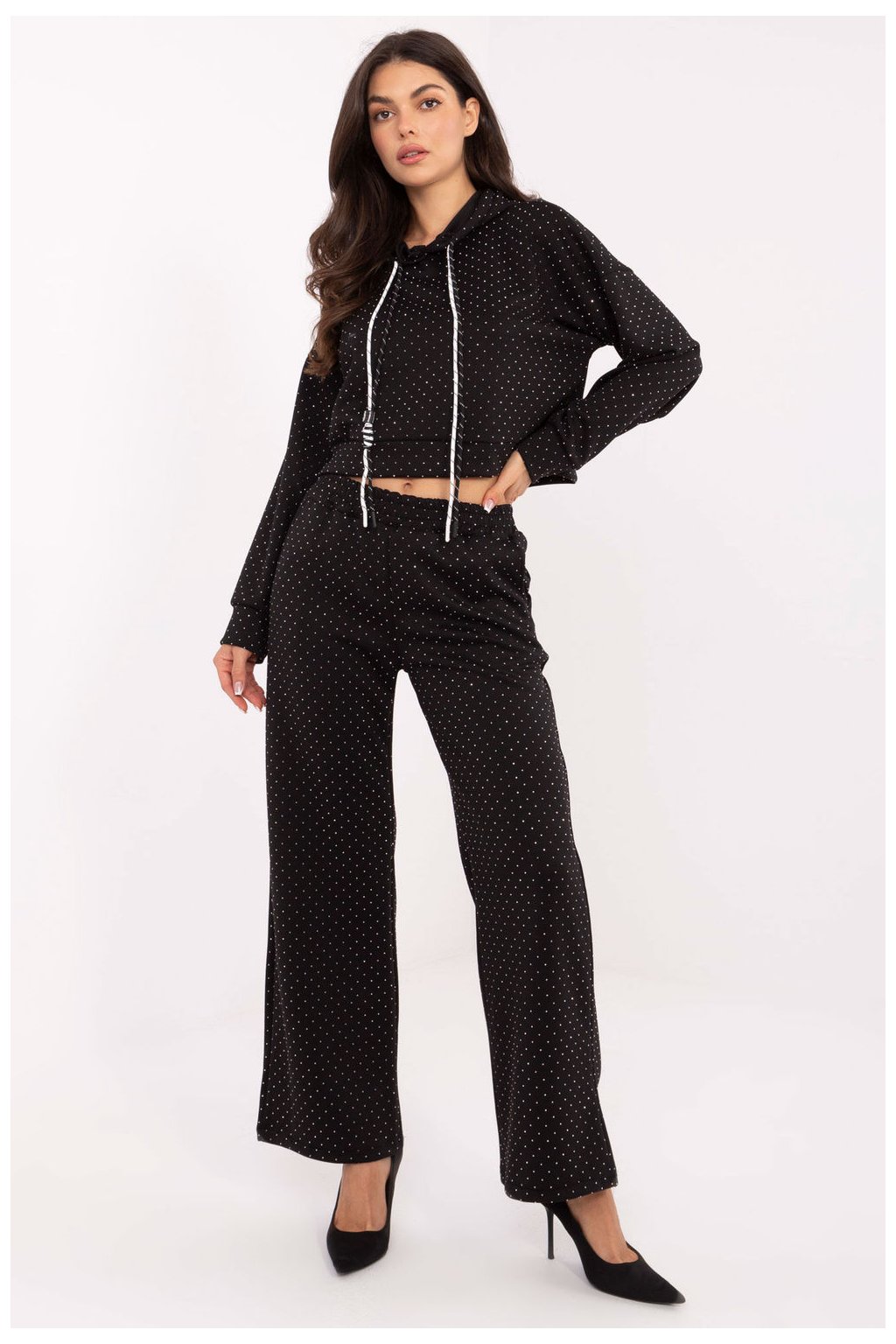 Tento dámský teplý set kombinuje eleganci a pohodlí, ideální pro každodenní stylování v casual stylu. Souprava se skládá z mikiny s kapucí a šňůrkami a kalhot s vysokým pasem a vsazenou gumou, vytvářející pohodlný a stylový vzhled. Vyrobený z směsi viskózy a polyesteru, set je příjemný na dotek, elastický a poskytuje volnost pohybu. Celou plochu látky zdobí efektní aplikace z flitrů, která dodává soupravě jemný lesk a eleganci. Kalhoty s širokými, dlouhými nohavicemi a bočními kapsami s zipem zvyšují pohodlí nošení, zatímco dlouhý rukáv mikiny a kapuce se šňůrkami dokončují funkční design. Je to ideální volba pro ženy, které chtějí spojit pohodlí teplákové soupravy s elegantním vzhledem v každodenním stylování.