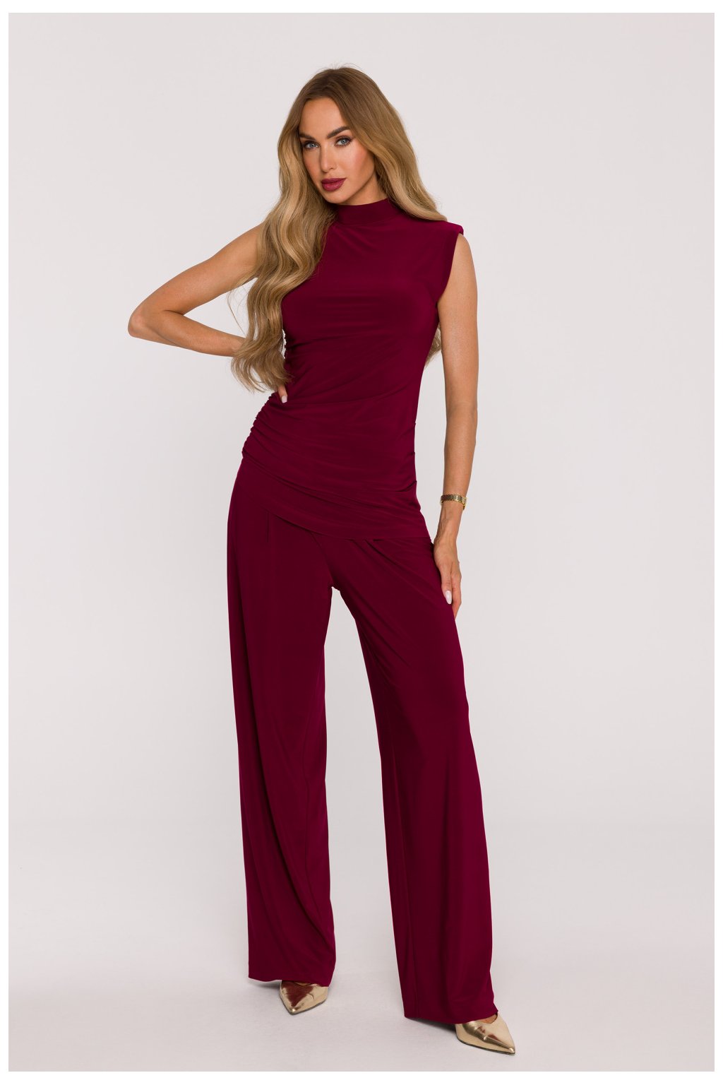 Moderní a elegantní dámský komplet vyrobený z hladké pleteniny, která je měkká, elastická a mimořádně pohodlná k nošení. Toto spojení pohodlí s rafinovaným stylem je ideální jak na každodenní nošení, tak na speciální příležitosti. Halenka bez rukávů okouzluje přiléhavým střihem, rolákem a decentním záhybem, který zdůrazňuje siluetu a dodává jí lehkost. Asymetrické zakončení dole přidává moderní akcent a opticky zúžuje postavu. Kalhoty s volným střihem mají široké nohavice a záložky na pasu, díky nimž se krásně přizpůsobují postavě a poskytují plnou volnost pohybu. Boční kapsy přidávají funkčnost a skrytý zip vzadu zaručuje estetické dokončení. Komplet nemá podšívku, což ho činí lehkým a prodyšným. Celý set byl navržen a ušit v Polsku s péčí o každý detail. Tento dvoudílný set je skvělou volbou pro ženy, které oceňují pohodlí, eleganci a moderní minimalismus.