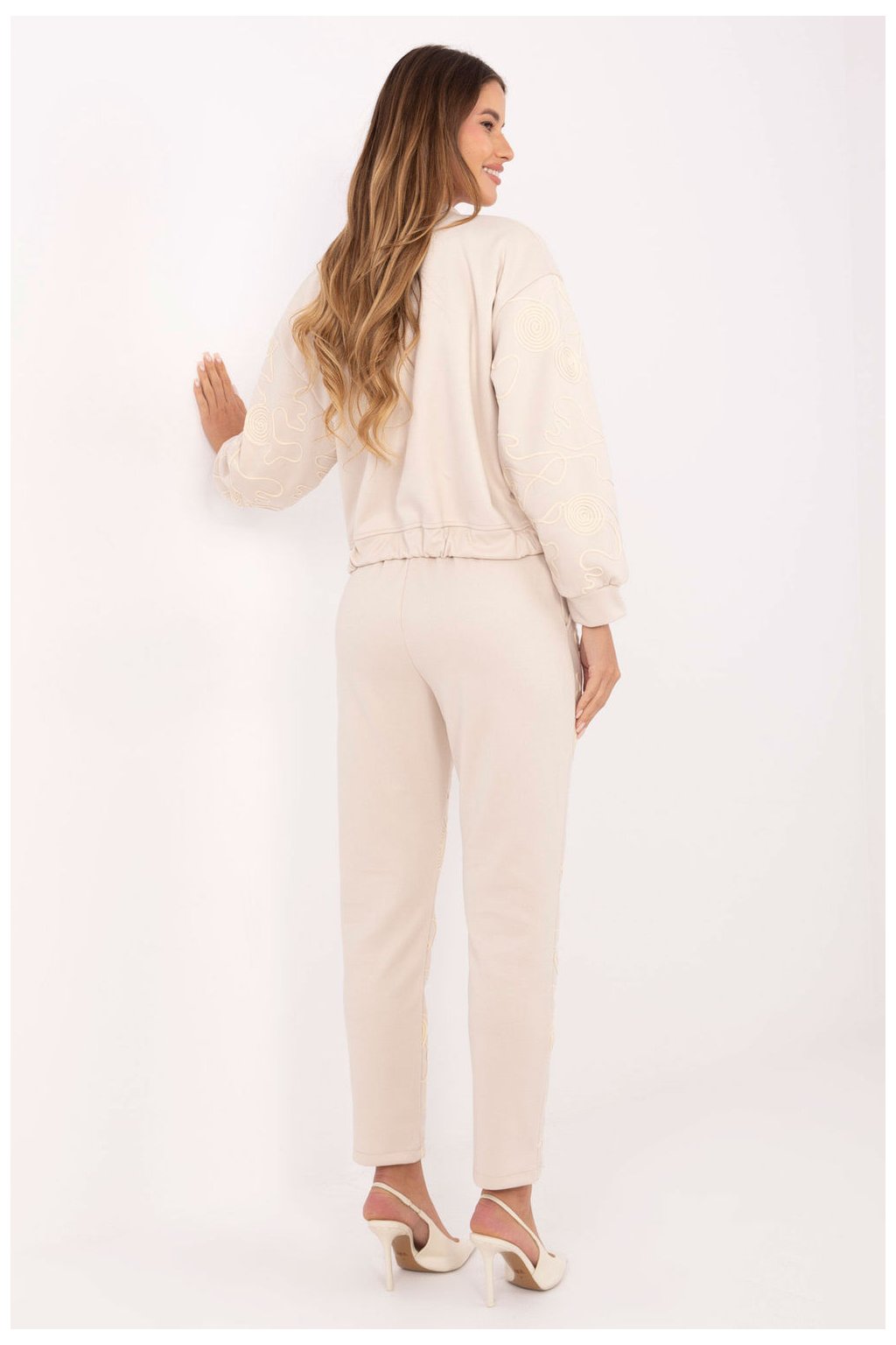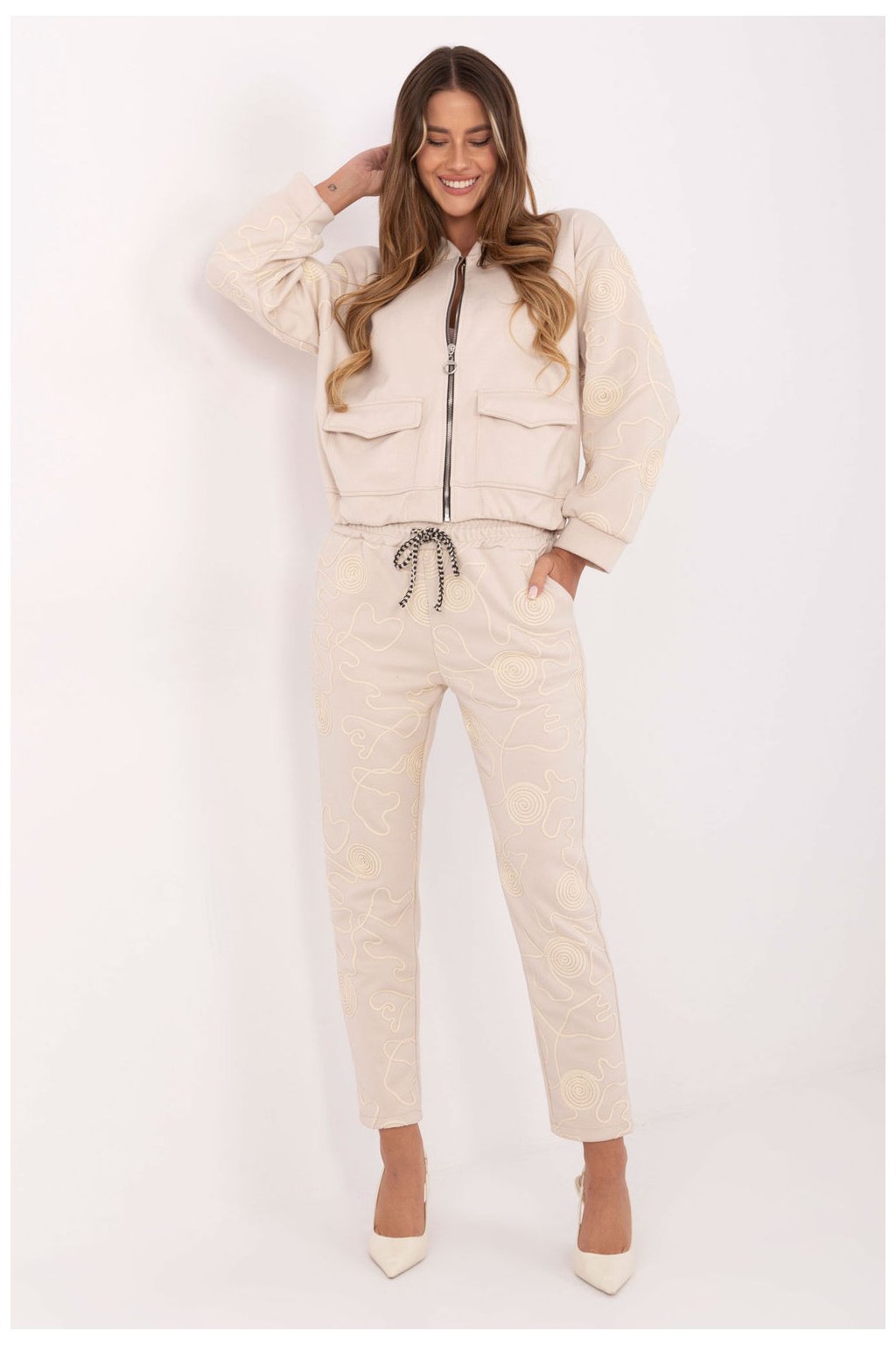 Elegantní a pohodlný dámský teplákový set skládající se z mikiny se zipem a kalhot s páskem. Vyrobený z vysoce kvalitní směsi viskózy a polyesteru, poskytuje měkkost, pružnost a pohodlí po celý den. Mikina má ležérní střih s límcem, dlouhými rukávy a kapsami s klopnami na přední straně, které jí dodávají charakter a praktičnost. Kalhoty mají vysoký pas, zúžené nohavice a boční kapsy, co zajišťuje pohodlí a moderní vzhled. Celý vzhled dotvářejí ozdobné vyšívání umístěné na rukávech mikiny a na přední straně kalhot, které dávají setu výjimečný, elegantní charakter. Tento ležérní set je ideální volbou pro každodenní outfit, kombinující pohodlí, moderní design a ženský detail.
