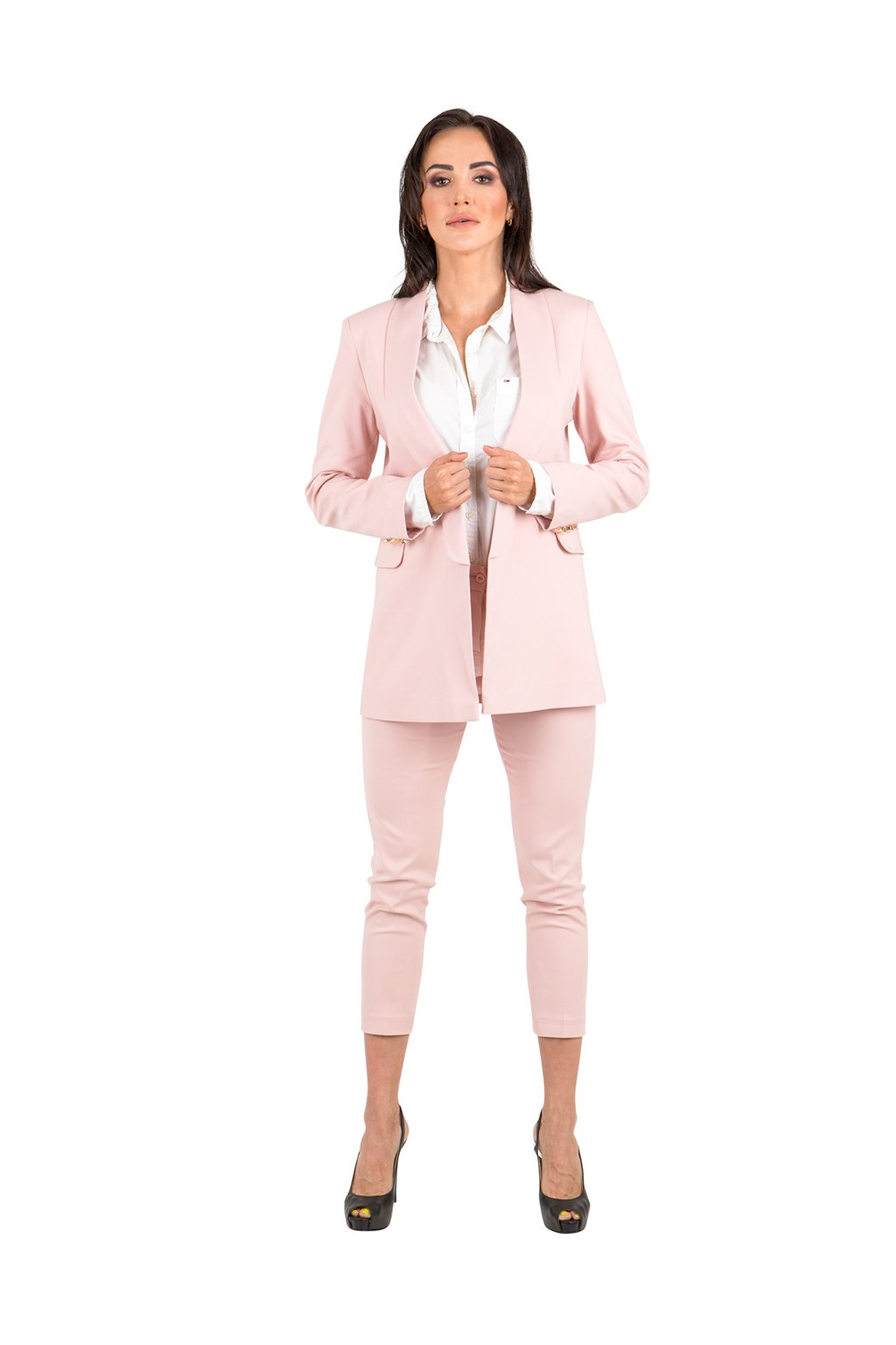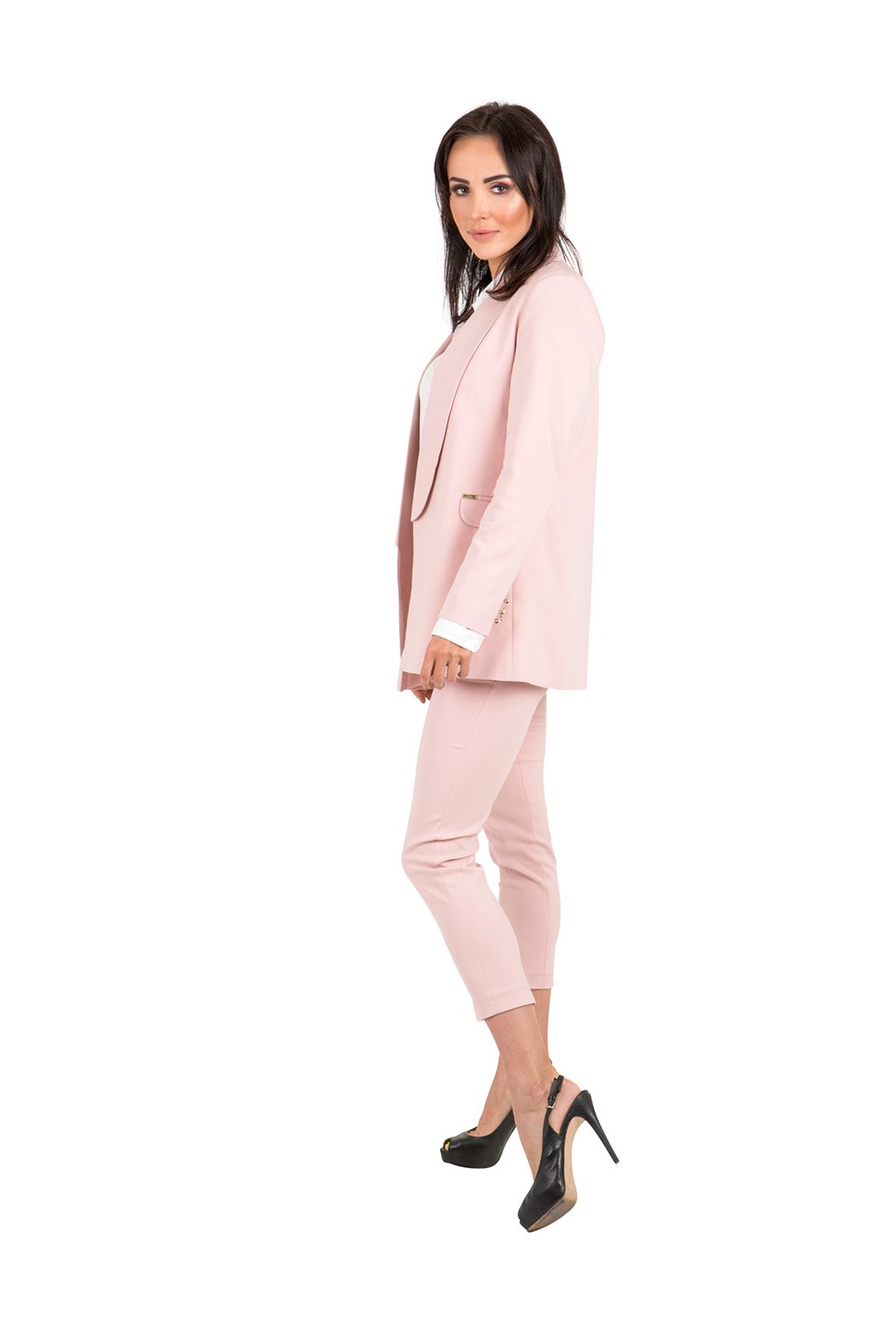 Prodloužené rozepnuté sako. Bunda s kapsami s nášivkami. Rukávy se třemi knoflíky.