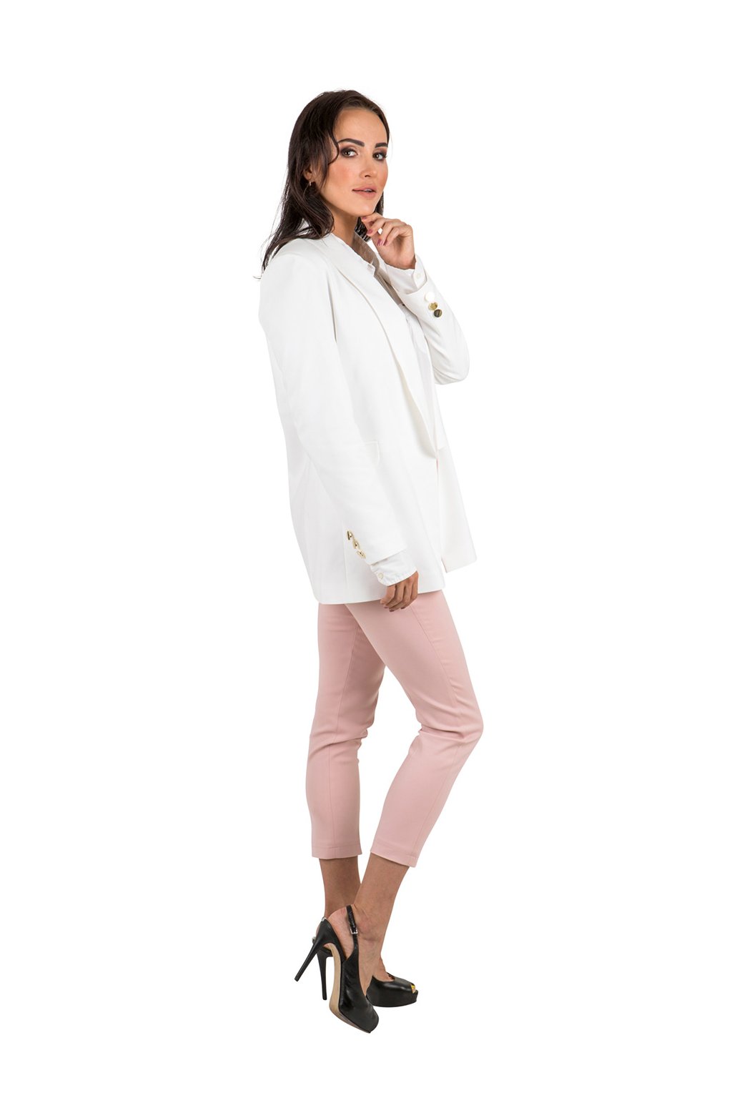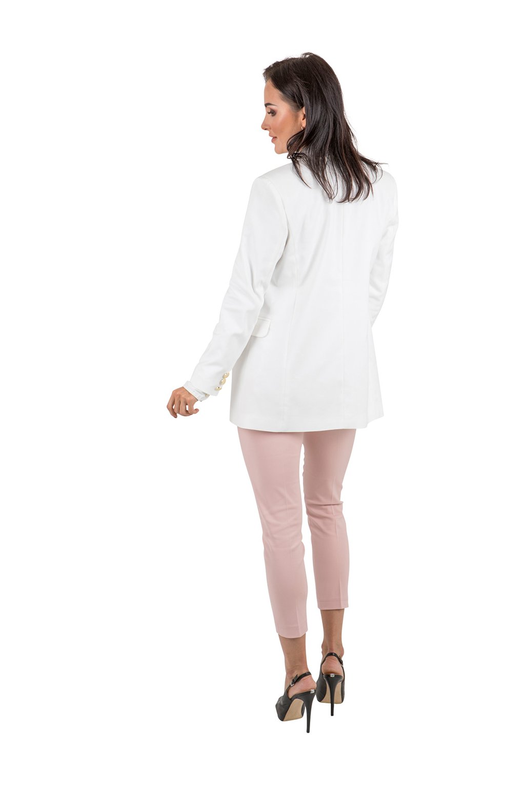 Prodloužené rozepnuté sako. Bunda s kapsami s nášivkami. Rukávy se třemi knoflíky.