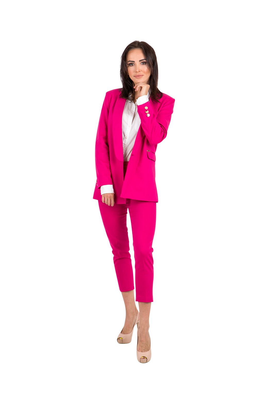 Prodloužené rozepnuté sako. Bunda s kapsami s nášivkami. Rukávy se třemi knoflíky.