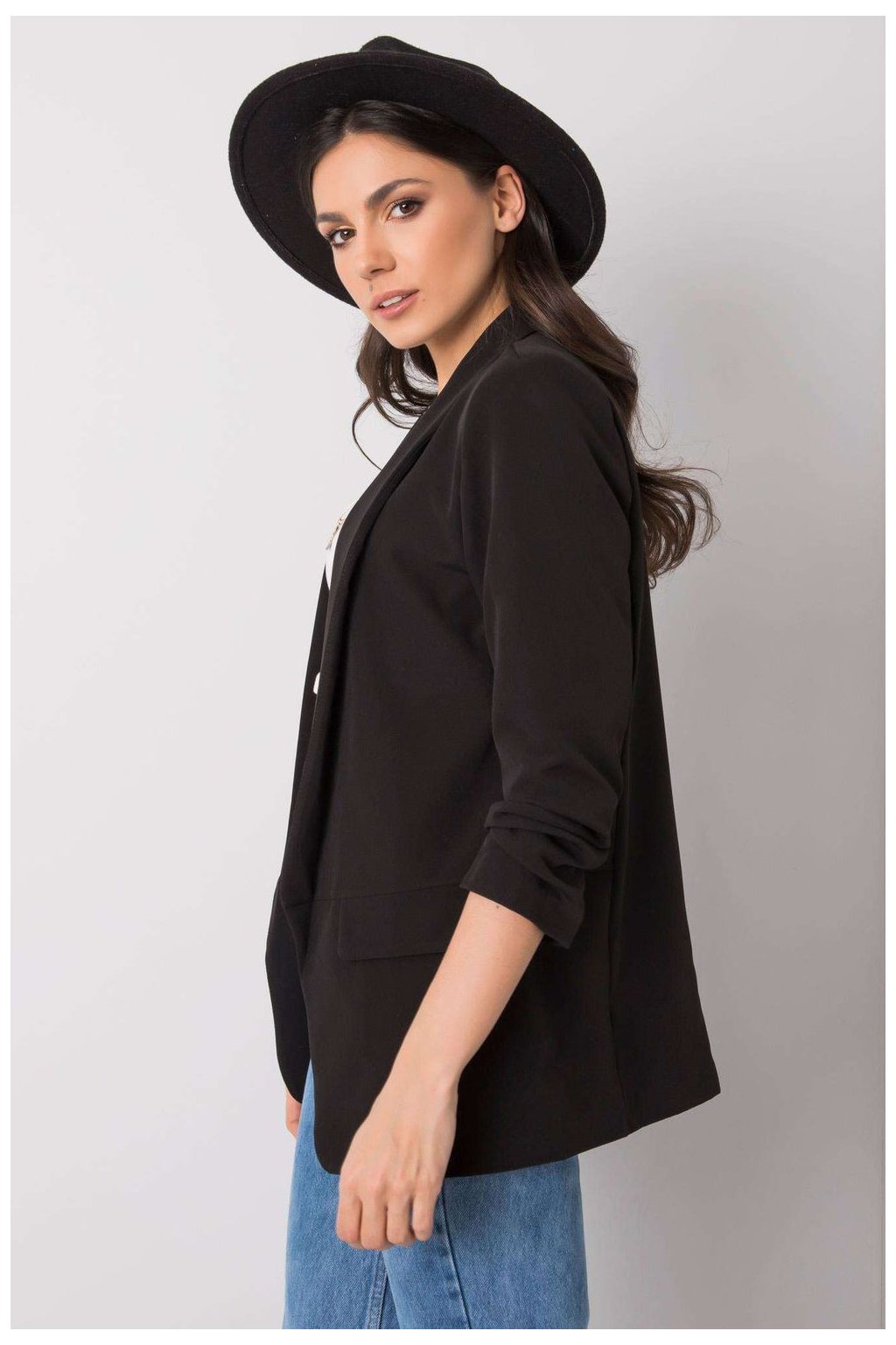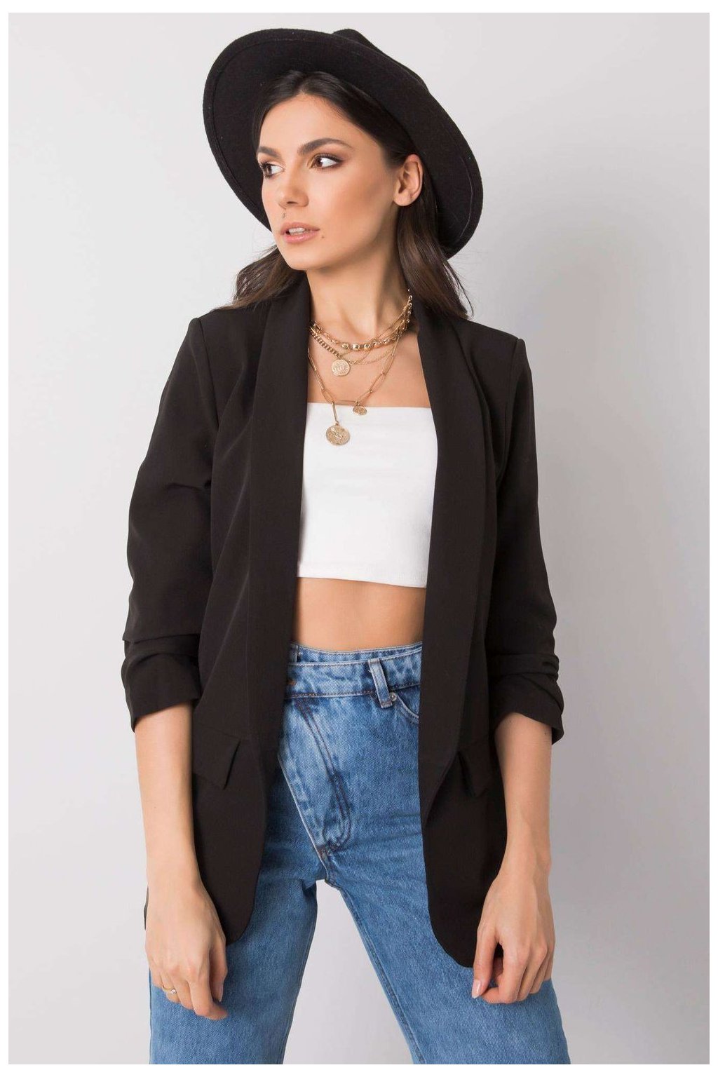 Dámské rozepínací sako v černé barvě. Polštáře přišité na ramenou.