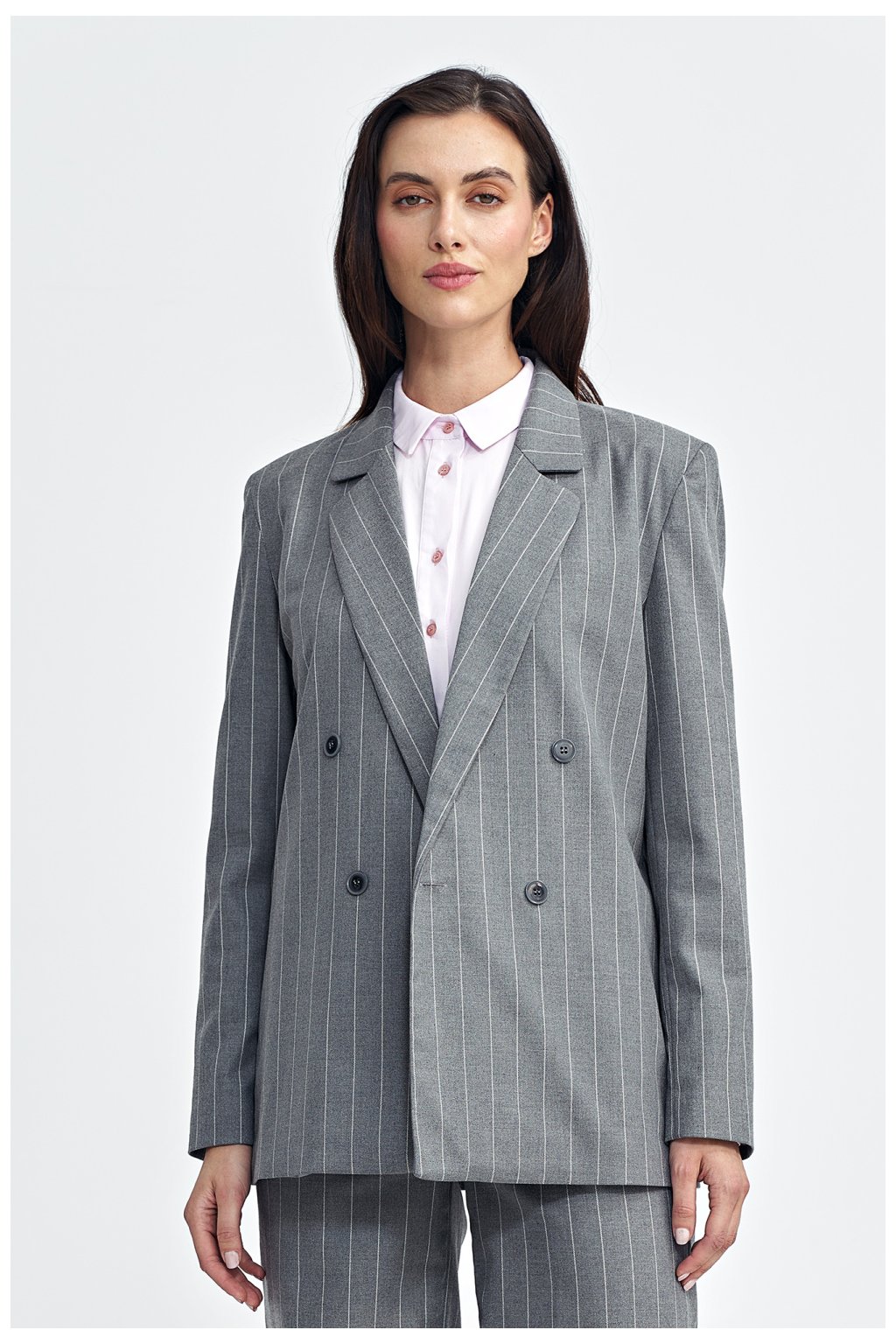 Sako s nadrozměrným střihem vyrobené z materiálu s jemnými kontrastními proužky v tenisovém stylu. Má límec s vykládanými klopy a dlouhé rukávy se spodními knoflíky. Na ramenou jsou polštářky, které dodávají siluetě výraznosti a elegance. Sako má délku nad linii boků, co zdůrazňuje jeho moderní charakter. Dvouřadé zapínání na knoflíky vpředu dodává klasický a nadčasový vzhled. Je vybaveno podšívkou, co zajišťuje pohodlí a estetiku nošení.