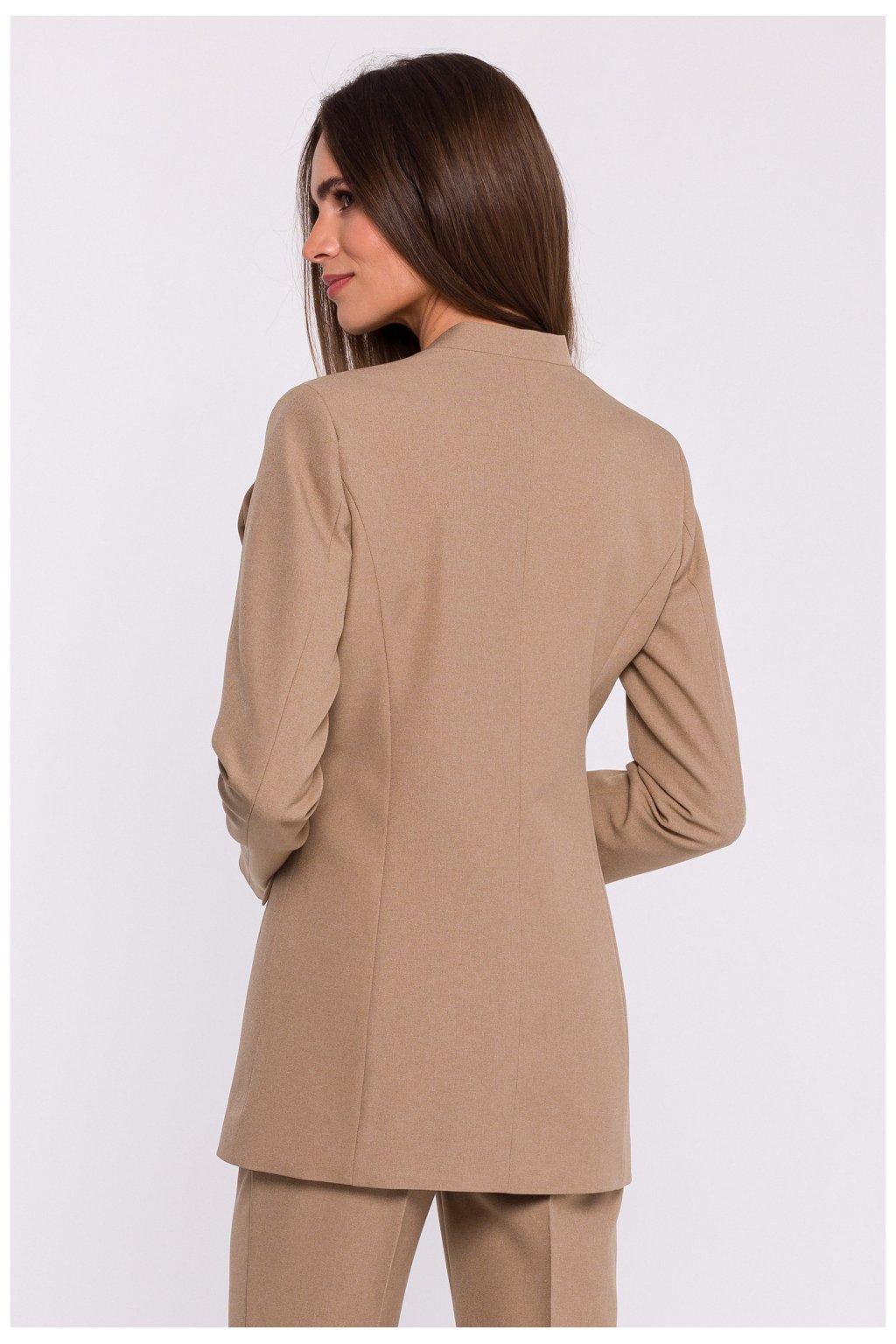 Elegantní dámské tkané sako s úzkým střihem, který zvýrazňuje siluetu. Je bez límce a zapíná se na jediný knoflík, který mu dodává moderní a minimalistický nádech. Na hrudi je připevněna ozdobná květina, která saku dodává jedinečný a ženský nádech. Kapsy s klopou přinášejí praktičnost a styl. Bunda je celá podšitá pro pohodlné nošení a vynikající povrchovou úpravu. Je navržena a ušita v Polsku a je ideální volbou pro ženy, které ocení eleganci s nádechem originality.