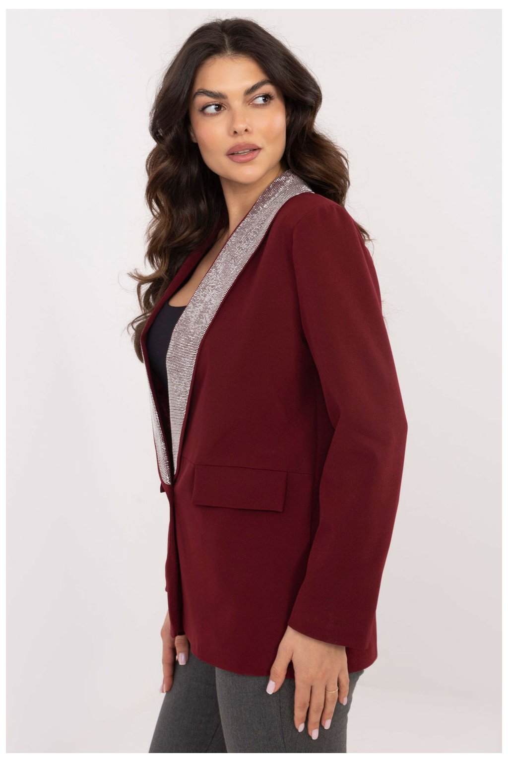 Elegantní dámský sako s ozdobnými límci a vloženými polštářky, skvělý na návštěvy a večerní vycházky. Vyrobený z látky obsahující polyester a viskózu, poskytuje pohodlí nošení a skvělé padnutí. Standardní délka a klasický střih s jedním knoflíkem jí dodávají nadčasový šarm, zatímco dlouhý rukáv a pečlivě vyrobená podšívka zvyšují pohodlí. Límce zdobené decentními žetony dodávají celku jedinečný charakter a trochu lesku, skvěle zapadající do elegance saka.