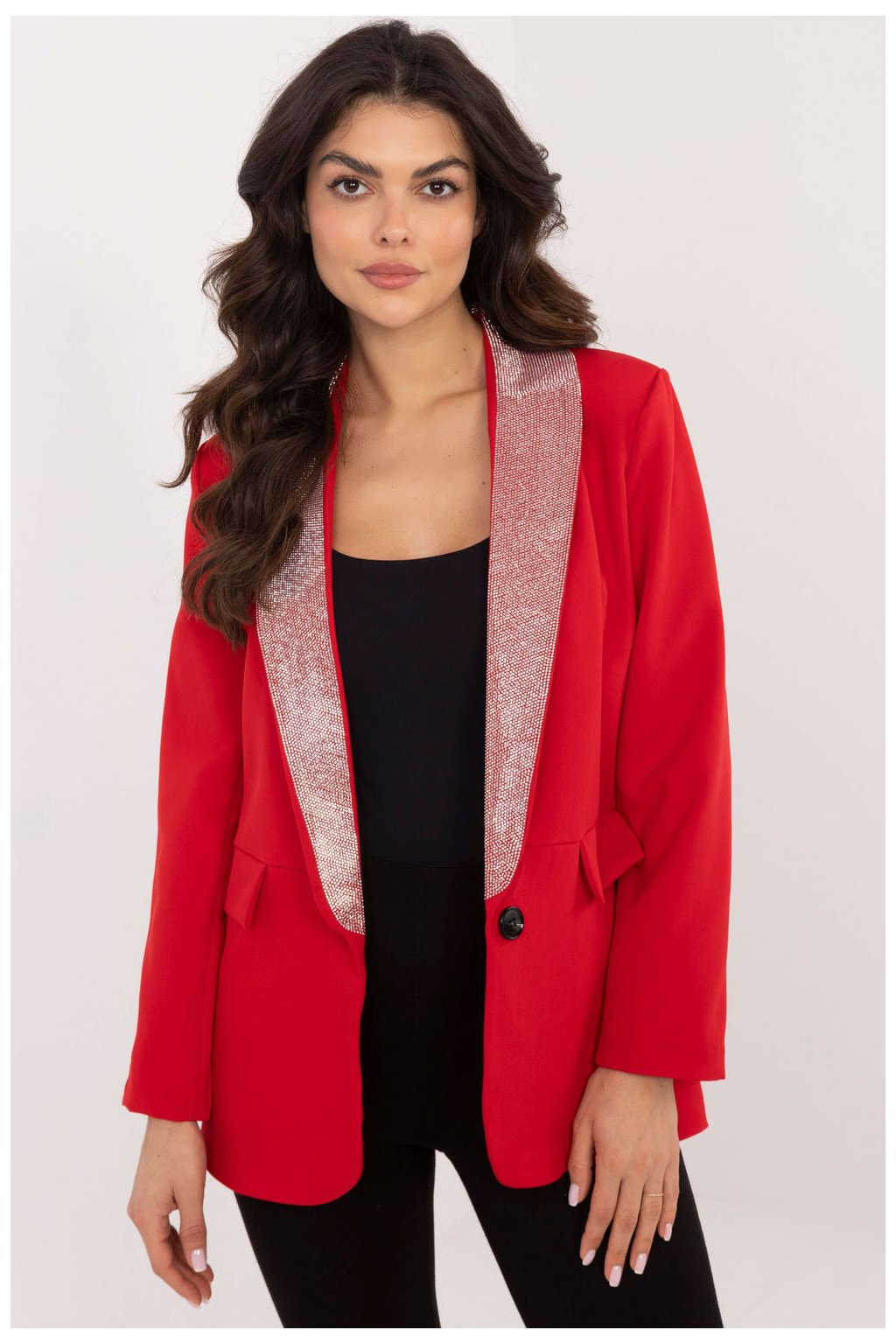 Elegantní dámský sako s ozdobnými límci a vestavěnými polštářky, skvělý na slavnostní příležitosti a večerní vycházky. Vyrobena z látky obsahující polyester a viskózu, poskytuje pohodlí nošení a skvělé přizpůsobení. Standardní délka a klasický střih s jedním knoflíkem jí dodávají nadčasový šarm, zatímco dlouhý rukáv a pečlivě vyrobená podšívka zvyšují pohodlí. Límce zdobené decentními flitry dodávají celku výjimečný charakter a trochu lesku, ideálně zapadající do elegantního stylu saka.