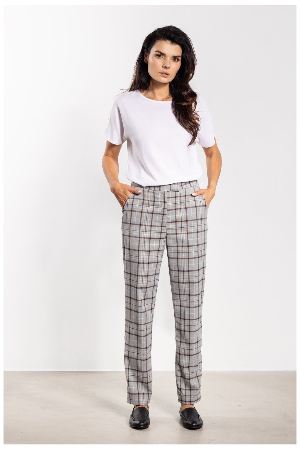 Elegantní cygaretkové kalhoty v tradičním vzoru kostky spojují styl a pohodlí. Jednoduchý, přizpůsobivý střih krásně padne na postavě a střední výška pasu poskytuje pohodlí po celý den. Charakteristická kostka přidává elegance, díky čemuž se kalhoty hodí jak do kancelářských, tak do každodenních stylizací. Praktické boční kapsy zvyšují funkčnost a univerzální design umožňuje kombinovat je s košilemi, svetry nebo saka, vytvářející různorodé, efektní outfity.