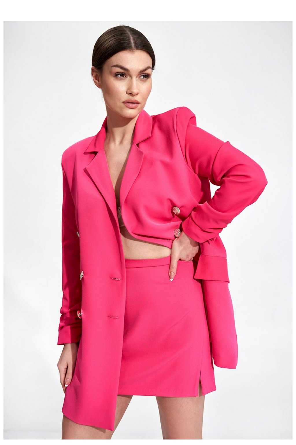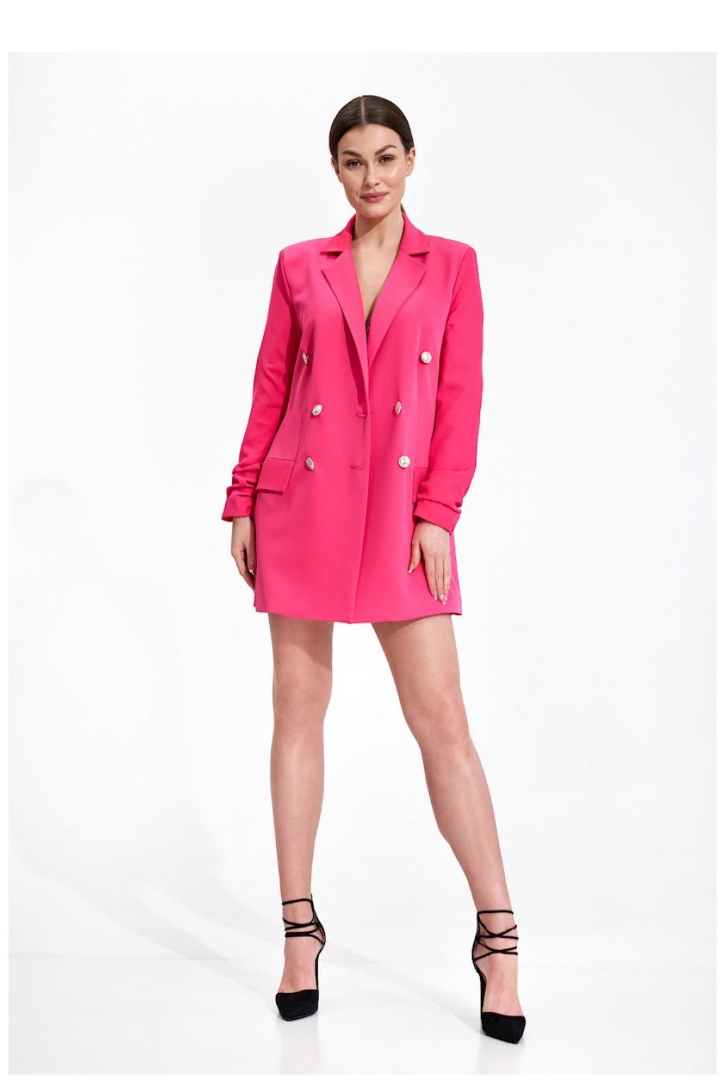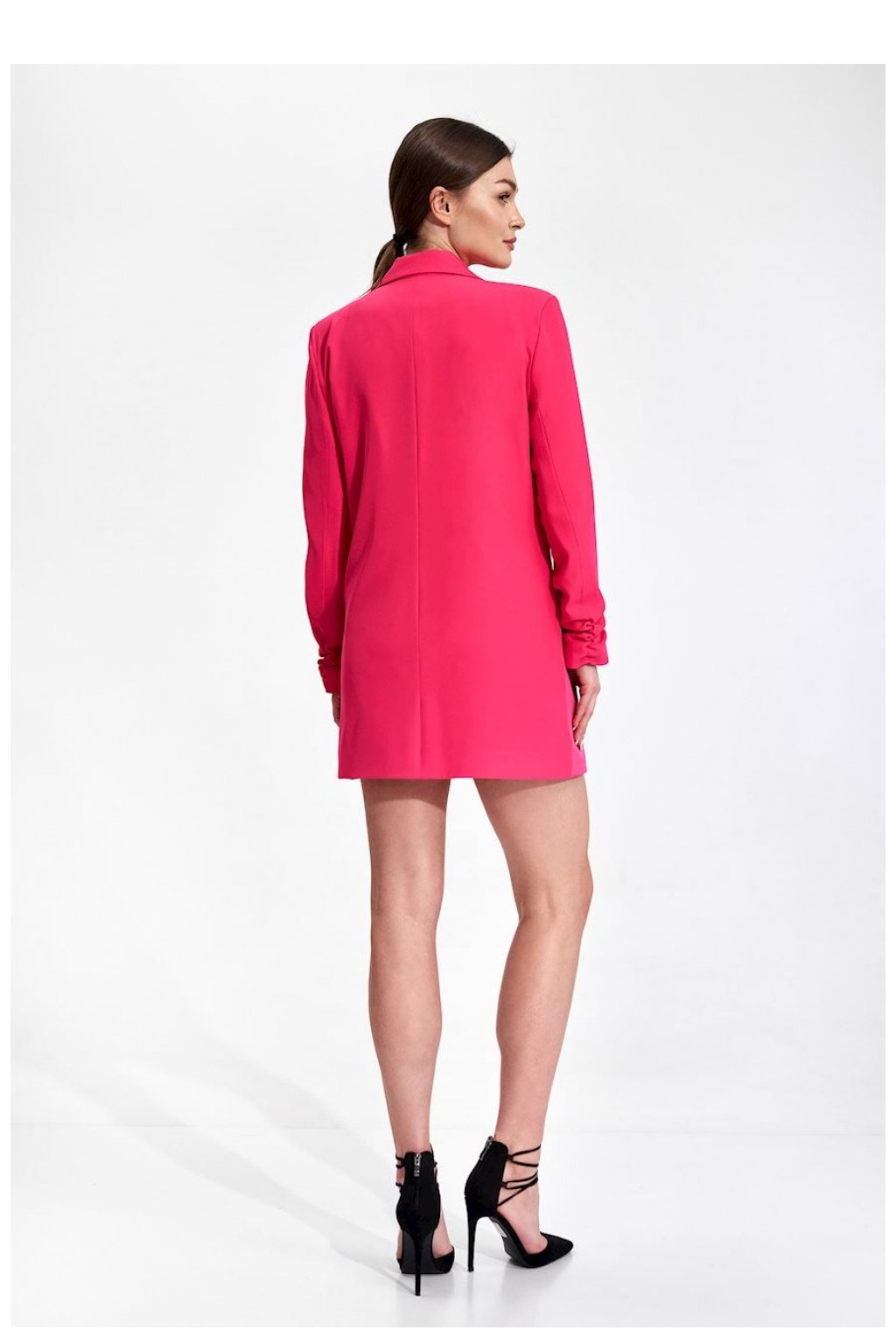 Dlouhé sako volného střihu s ozdobnými dvouřadovými knoflíky, rukávy dole nařasené. Kapsy s klopami, podšité.