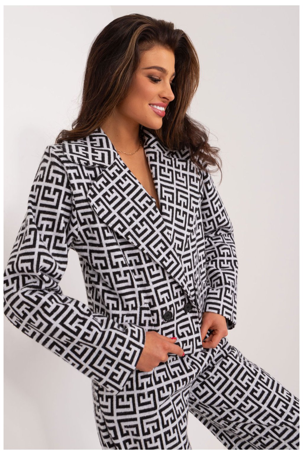 Dámské sako je ideální pro ženy, které si cení elegance a stylu, a vypadá výjimečně ve všech situacích, ať už v práci nebo při důležitých obchodních či formálních schůzkách. Díky své univerzálnosti je ideální pro podzimní/zimní a jarní období. Tento elegantní oděv má dlouhé rukávy, takže je vhodnou volbou pro chladnější dny. Dominantním vzorem je geometrický motiv, který saku dodává moderní a dynamický charakter. Je vyrobeno převážně z bavlny, což zaručuje pohodlné nošení a příjemný pocit na kůži. Zapínání na knoflíky usnadňuje oblékání a svlékání bundy, zatímco dvouřadový střih dodává celkovému vzhledu eleganci a šik. Klasické klopy zdůrazňují formální charakter saka a přispívají k jeho sofistikovanému vzhledu. Přítomnost podšívky je praktickým detailem, který nejenže zvyšuje pohodlí při nošení, ale také umocňuje estetiku saka. Díky těmto vlastnostem se toto dámské sako stává nezbytnou součástí šatníku žen, které chtějí zdůraznit své sebevědomí a styl v nejrůznějších situacích.