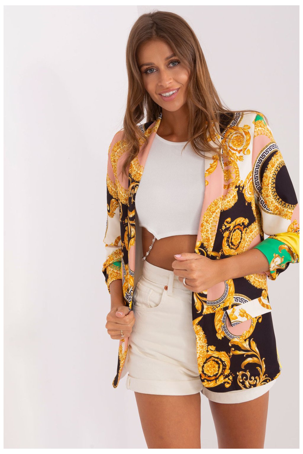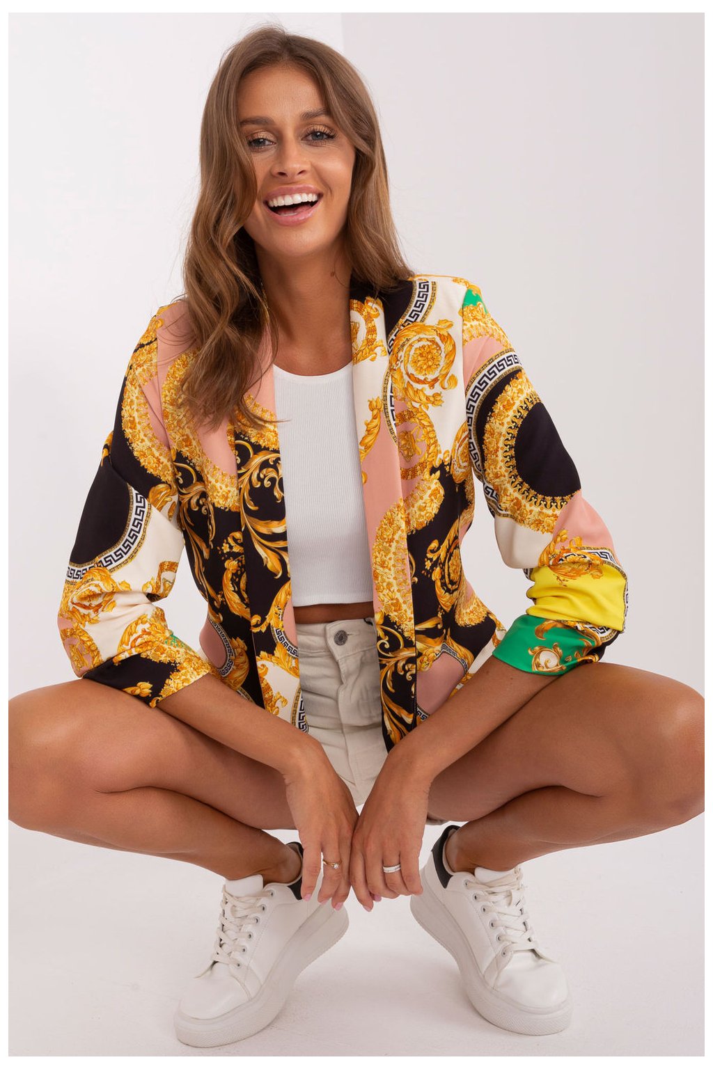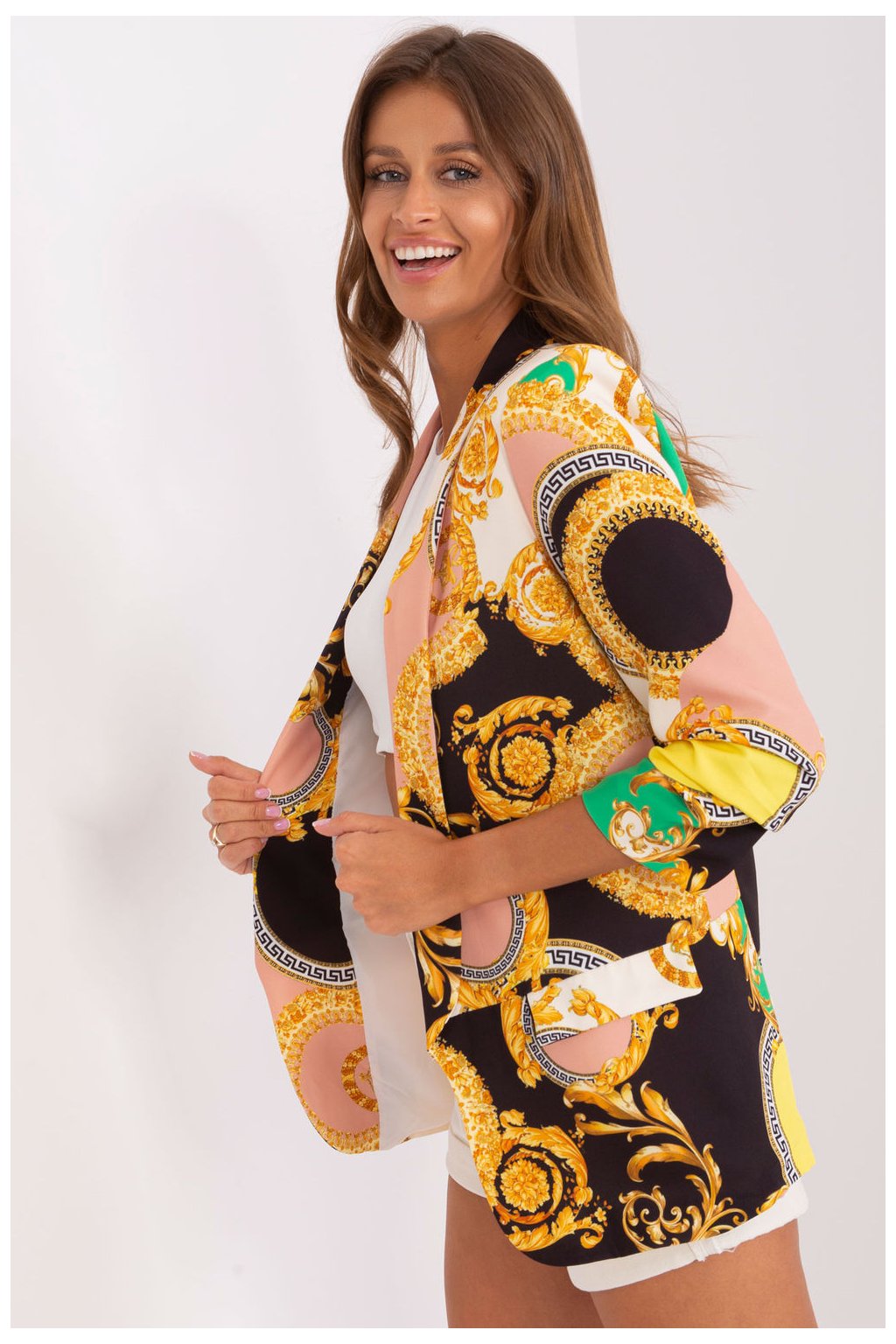 Toto rozepínací sako je kvintesencí stylu a elegance, která se hodí pro různé příležitosti, od běžných až po speciální události. Díky své univerzálnosti je ideální volbou pro různé příležitosti, od práce přes obchodní schůzky až po večerní akce. Použitý barevný potisk dodává saku jedinečný charakter a dynamiku, což mu propůjčuje individualitu a originalitu. Je ideální pro podzimně-zimní i jarně-letní sezónu, lze ji nosit po celý rok a přizpůsobit se různým stylům. Jeho standardní délka a 3/4 rukávy mu dodávají eleganci a jemnost, takže je dokonalým doplňkem ke kalhotám i sukním. Blejzr má také podšívku a ramenní vycpávky, které zajišťují nejen lepší padnutí, ale také větší pohodlí. Ať se toto rozepínací sako stane vaším spolehlivým společníkem pro každodenní styling i výjimečné příležitosti a podtrhne váš osobní styl a individualitu bez ohledu na roční období nebo příležitost.