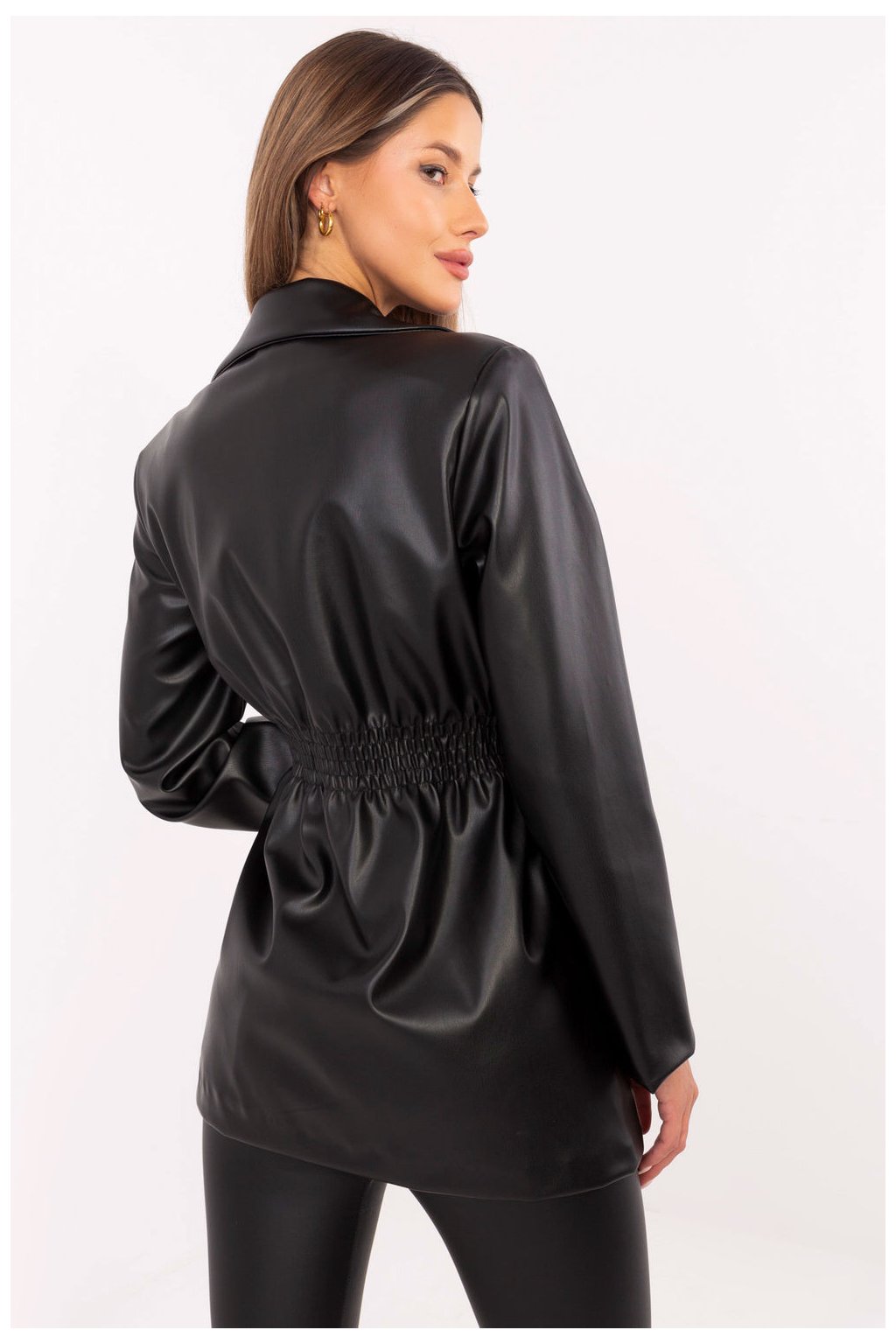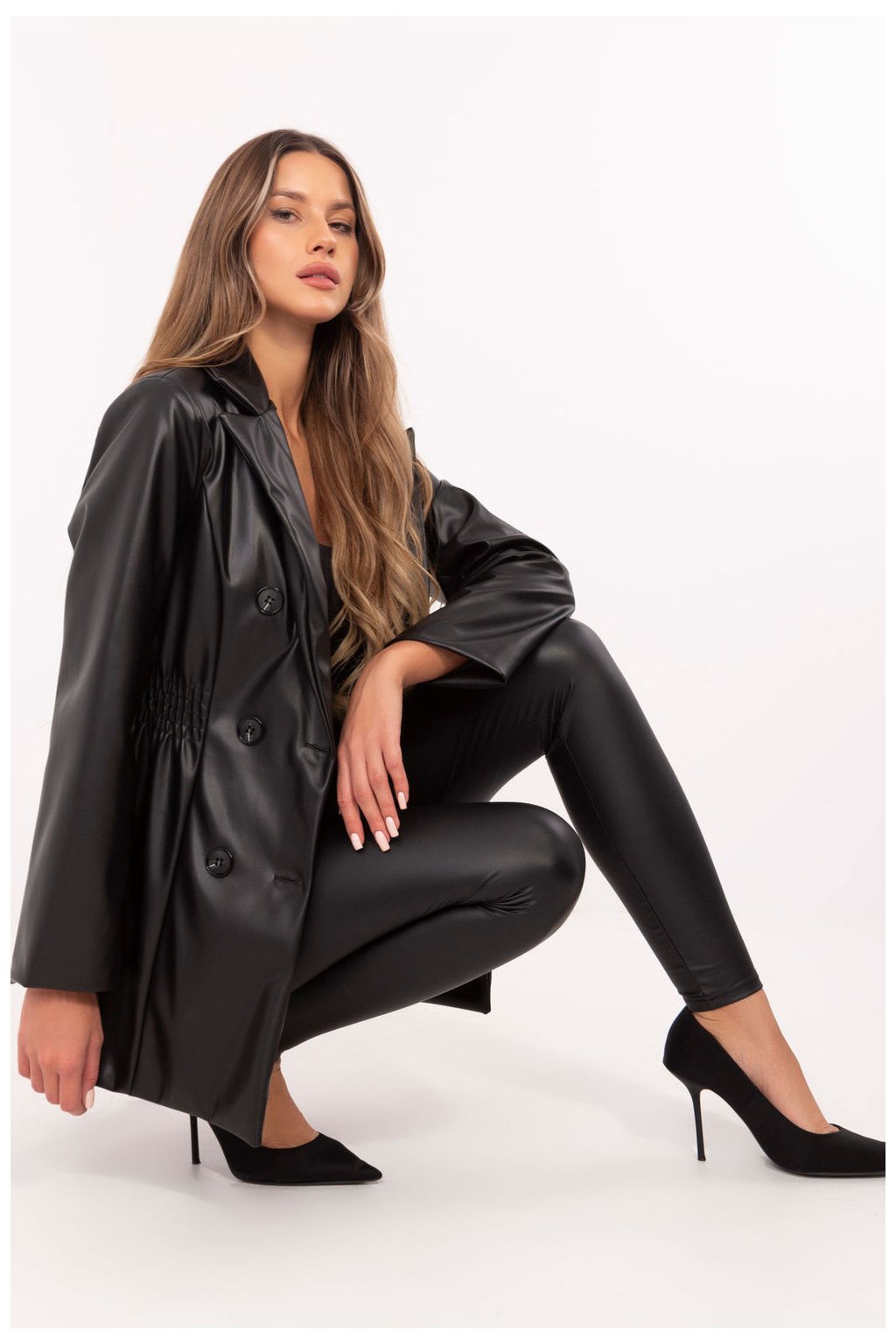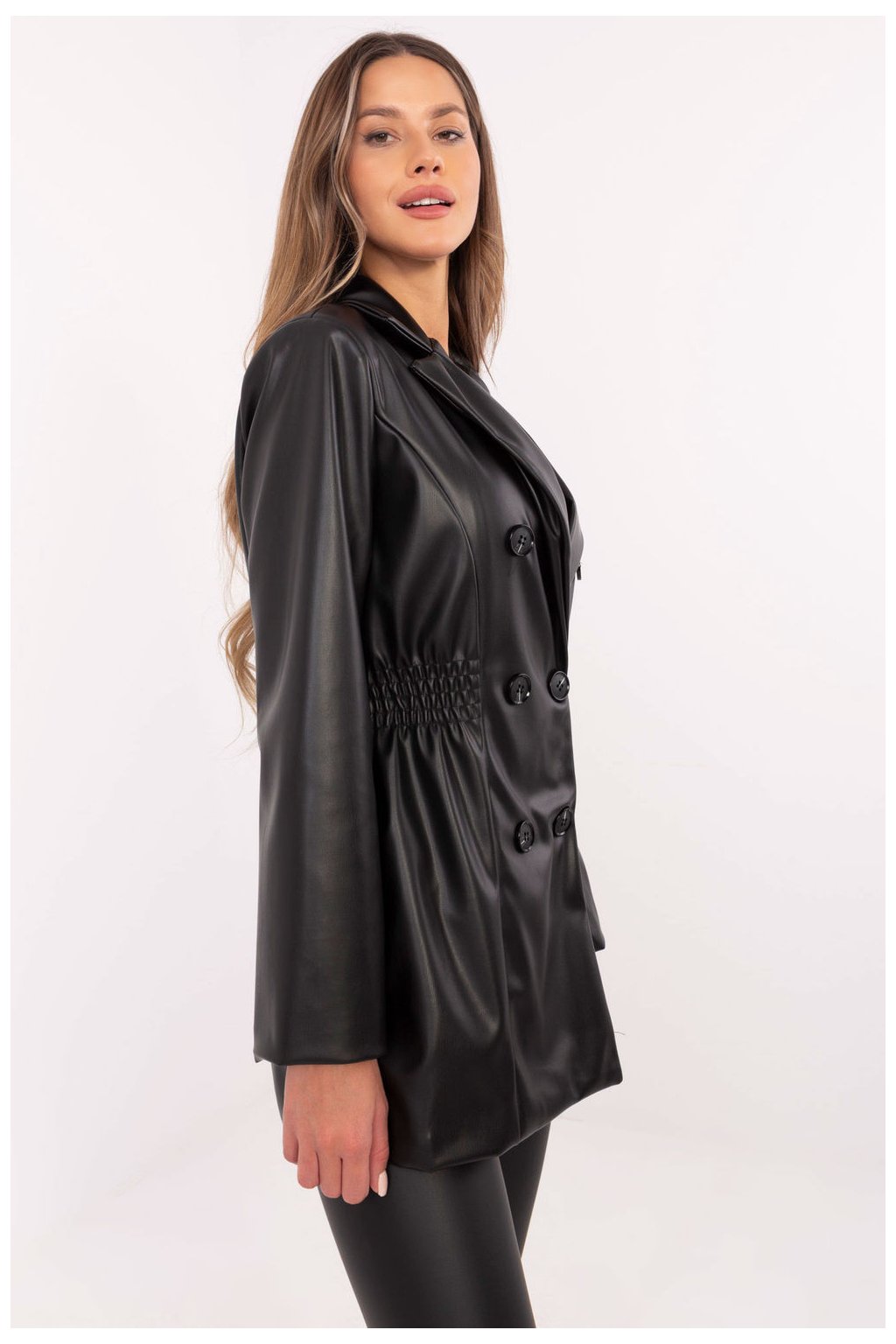 Elegantní dámský blejzr z ekokože je jedinečným prvkem šatníku, který kombinuje klasiku s moderním charakterem. Vyrobený z odolné směsi polyesteru a polyuretanu vypadá nesmírně elegantně a zároveň je praktický a snadno se udržuje. Díky podšívce poskytuje pohodlí v chladnějších dnech a činí z ní ideální volbu na podzim, zimu a jaro. Blejzr standardní délky se vyznačuje širokými límci, které mu dodávají nadčasový šarm, a vestavěnými polštářky na ramenou, které zdůrazňují siluetu a dodávají jí strukturu. Dvojitý řadový závěr na knoflíky posiluje elegantní charakter tohoto modelu, a ozdobné záhyby v pase opticky zeštíhlují postavu, dodávajíce blejzru ženský výraz. Je to skvělá volba na různé příležitosti, od každodenních stylizací po společenská setkání nebo pracovní dny. Blejzr skvěle ladí jak s elegantními kalhotami, tak s džínami, umožňující vytváření různorodých, stylových outfitů.
